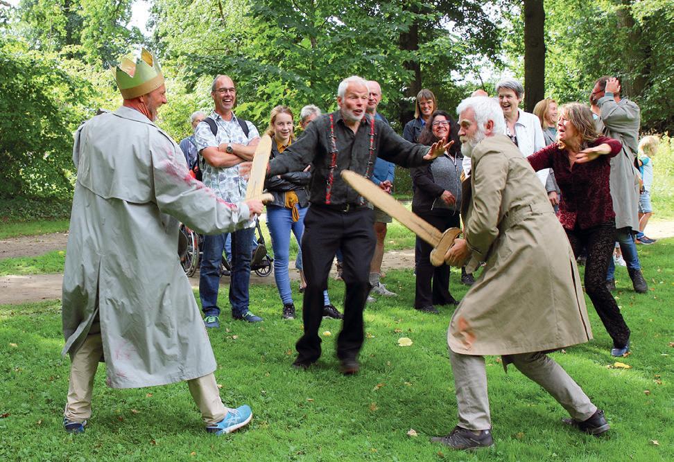 Tijdens deze wandeling krijg je op een heel ongedwongen en uiterst komische wijze een onmisbaar stukje theatrale kennis mee. Elementen uit de omgeving dragen sterk bij aan de beleving. Moord, liefde, eerzucht en jaloezie. Dat kan alleen maar goed gaan als je er met volle teugen van geniet. Om ongelukken en wraakgevoelens echt helemaal uit te sluiten wordt er gewerkt met zwaarden en kronen van karton.