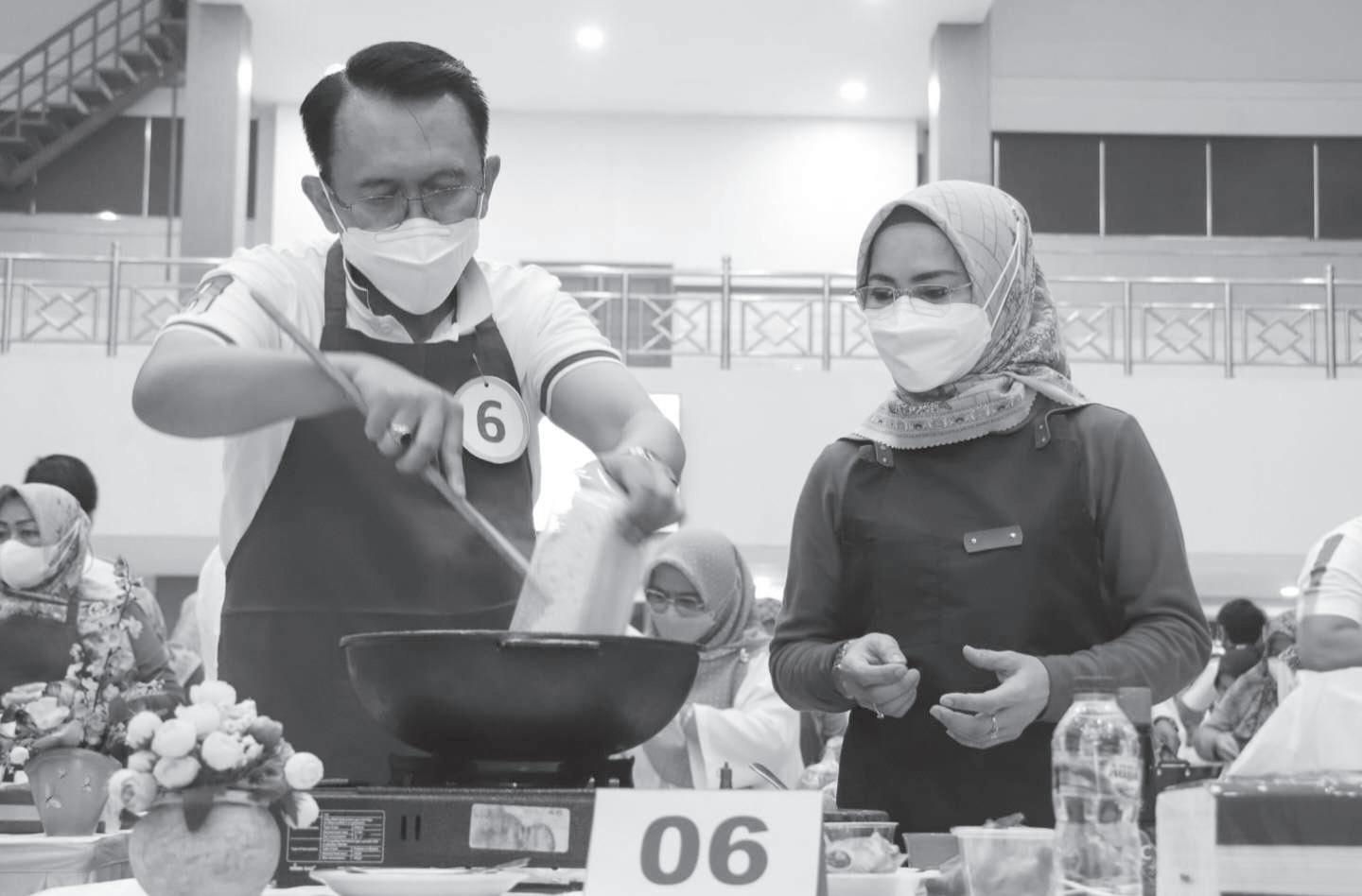 KABUPATEN BEKASI - Per ingatan Hari Ulang Tahun (HUT) ke-23 Dharma Wanita Persatuan (DWP) Tahun 2022 tingkat Kabupaten Bekasi di meriahkan dengan Lomba memasak nasi goreng sebagai makanan khas Nusantara, di Gedung Swastantra Wibawa mukti Komplek Pemkab Beka si Sukamahi, Cikarang Pusat. Acara yang diikuti oleh jaja ran Forkopimda, para kepala perangkat daerah dan para camat ini dibuka langsung oleh Pj Bupati Bekasi Dani Ramdan didampingi Pj Ketua TP-PKK Kabupaten Bekasi Ria Dani Ramdan.