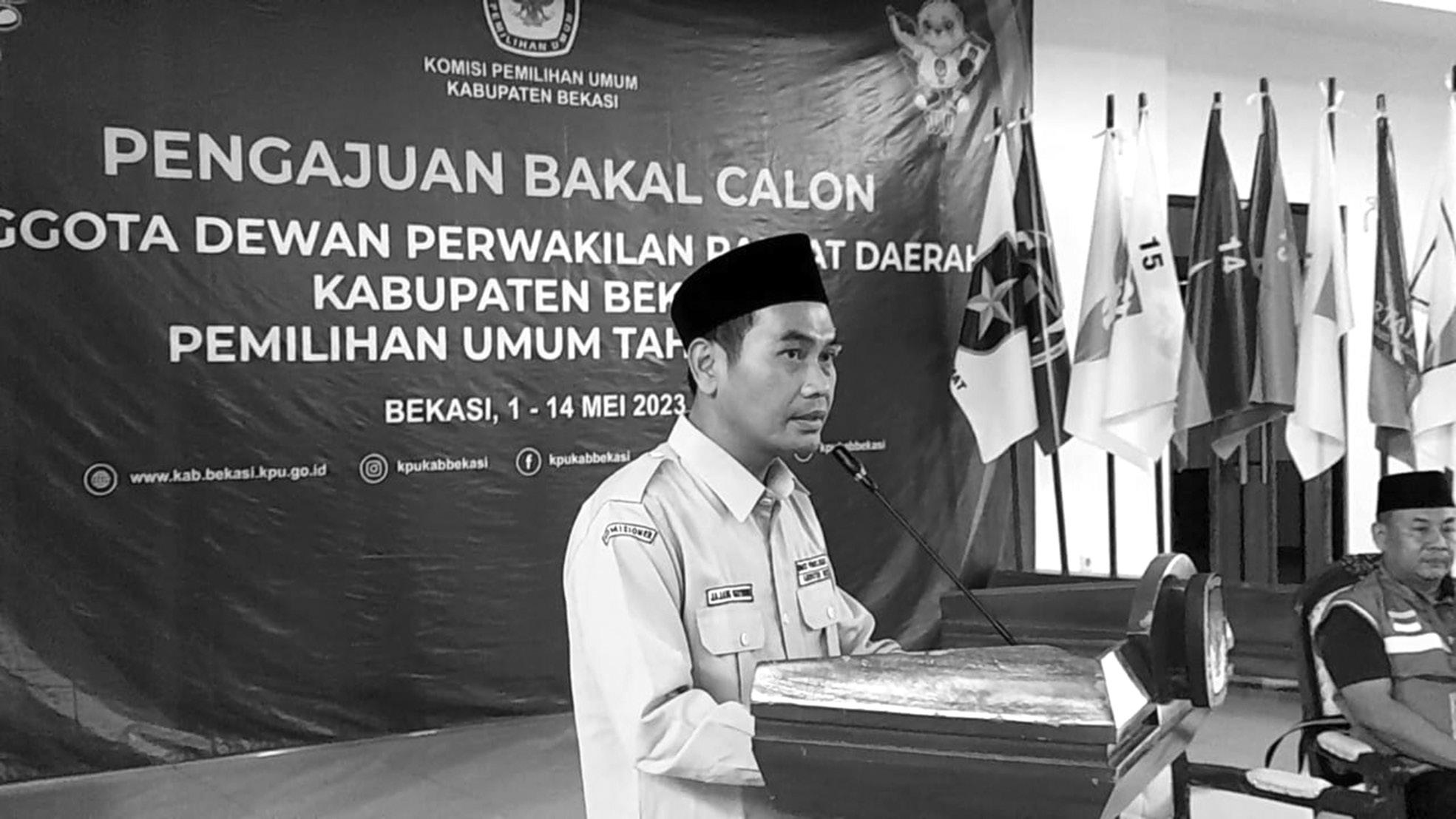 itu diprint oleh mereka. Lalu diserahkan ke kita, dengan surat persetujuan DPP yang juga ada di Silon, ini caleg kami, ini surat persetujuan DPP,” jelasnya. Setelah upload ke Silon dan berkas yang diserahkan sudah cocok, maka berkas pengajuan tersebut dapat diterima oleh KPU Kabupaten Bekasi. “Kalau tidak ISTIMEWA PEMILU: Ketua Komisi Pemilihan Umum (KPU) Kabupaten Bekasi Jajang Wahyudin mengemukakan partai politik memiliki peran dalam hal pendidikan politik kepada publik
