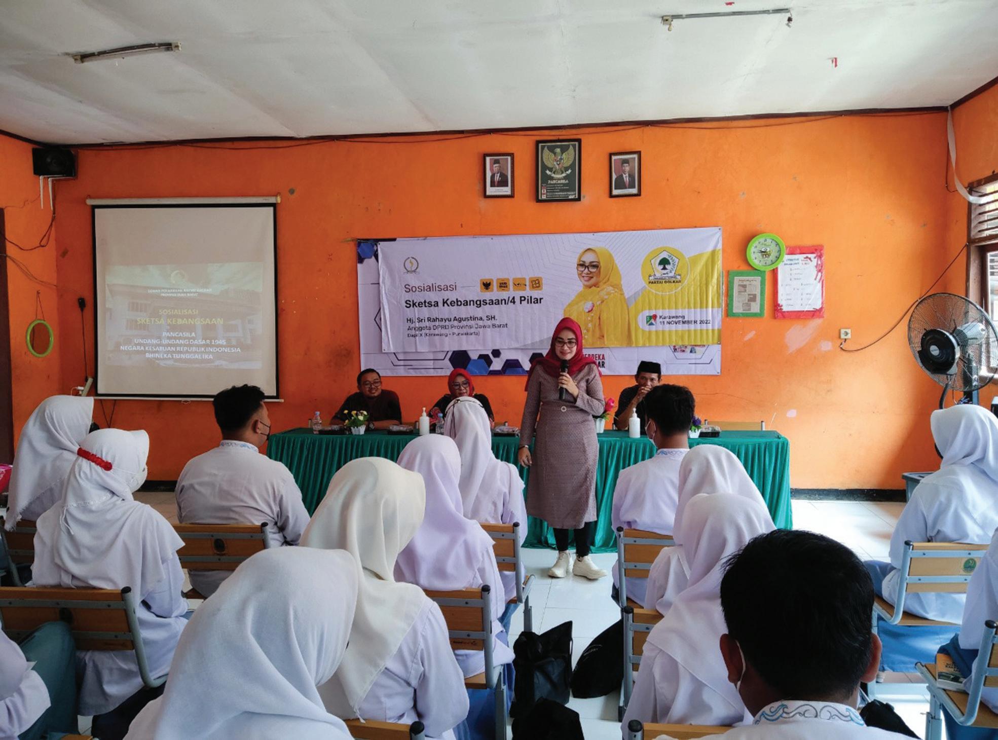 Fraksi Golkar, Hj. Sri Rahayu Agustina, S.H. beri sosialisasi mengenai sketsa empat pilar kebangsaan di SMKN 1 Klari pada 11 November 2022, Jumat lalu. Sosialisasikan Empat Pilar Kebangsaan di SMKN 1 Klari