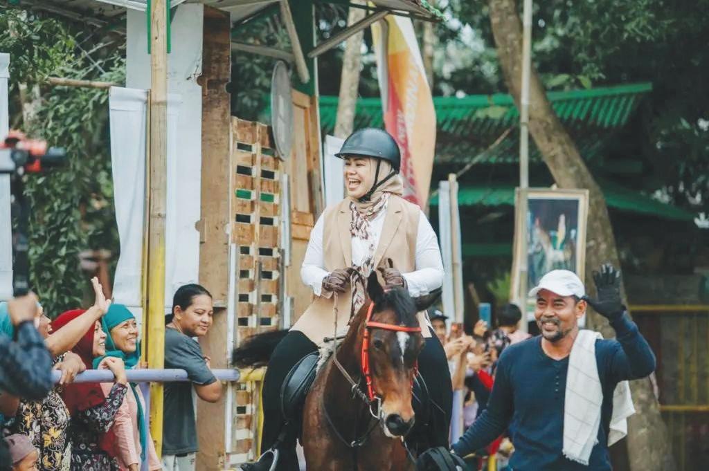 BUPATI Cellica Nurachadiana merasakan langsung rasanya men unggangi kuda yang berada di Dusun Bengle, Desa Pancakrya,