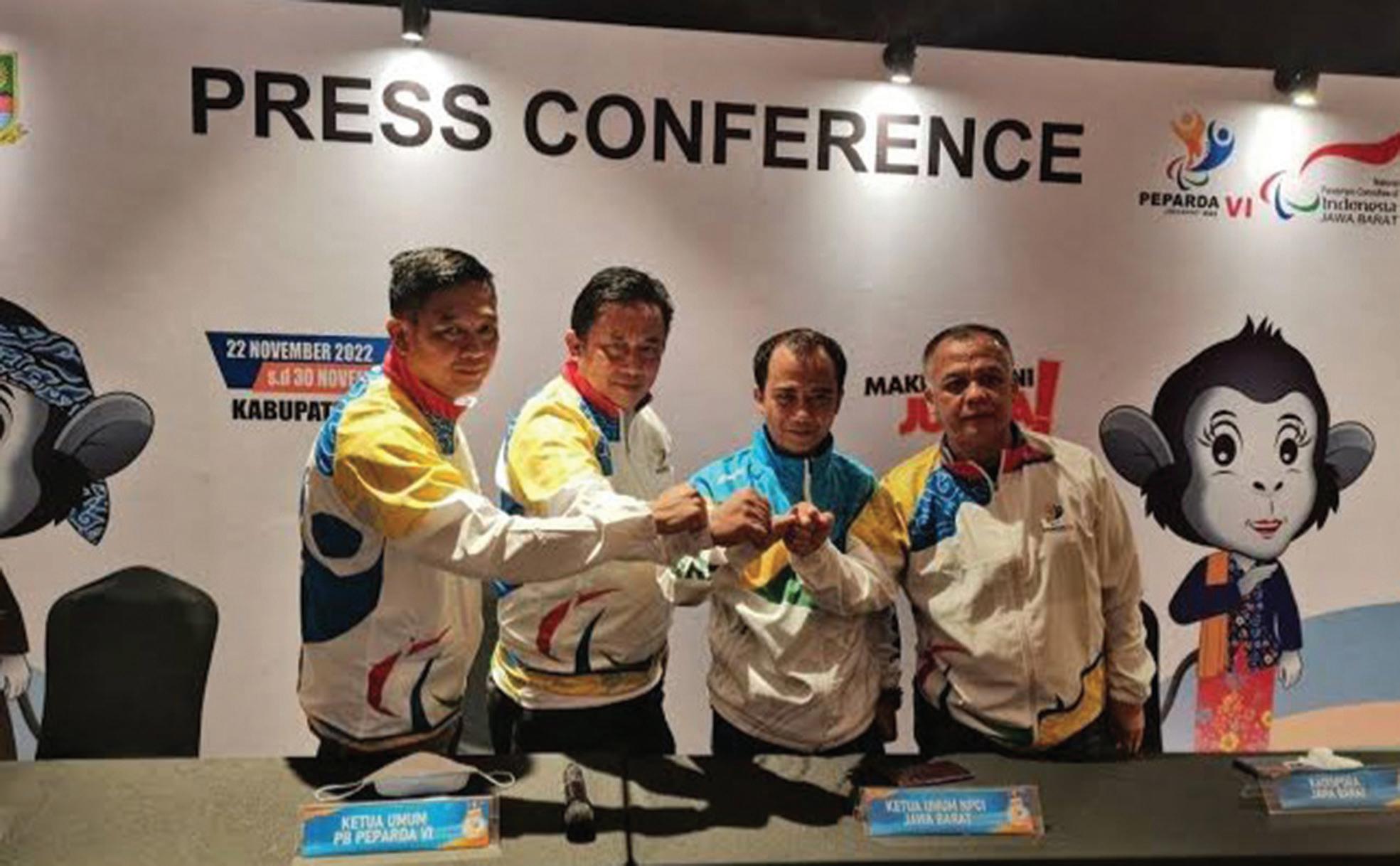 PB Peparda Dedi Supardi, ketua harian PB Peparda VI, Ketua Umum NPCI Jabar Supriatna Gu milar dan Kadispora Jabar Asep Suk hadir dalam acara jumpa pers dan pembukaan Peparda Jabar 2022 di Hotel Nuanza Kabupaten Bekasi, Selasa (22/11).