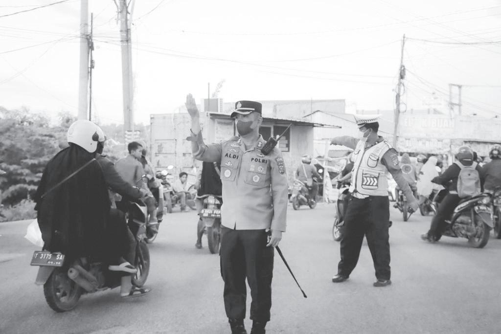 PELAYANAN : Kapolres Karawang AKBP Aldi Subartono turun langsung melakukan pengaturan arus lalu lintas di lokasi rawan macet di jalan Citra Kebun Mas (CKM) Karawang, Desa Kondang Jaya, Kecamatan Karawang Timur.