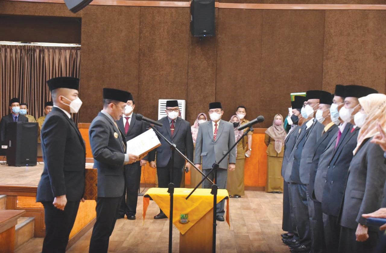 KABUPATEN BEKASI –Pemkab Bekasi melakukan rotas-mutasi sekaligus mel antik 11 pejabat tinggi prata ma di lingkungan Pemkab Bekasi, kemarin (26/9). Pj Bupati Bekasi Dani Ramdan hadir langsung melantik 11 pejabat tersebut sekaligus menyaksikan mereka men gucap sumpah jabatan.