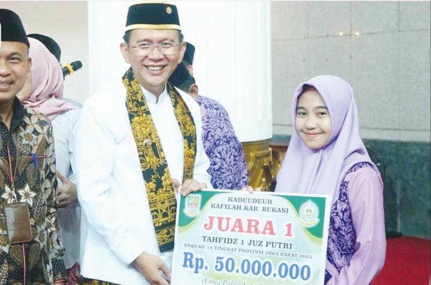 SEKILAS: Pemerintah Kabupaten Bekasi memberikan uang pembinaan (kadeudeuh) bagi para kafilah Kabupaten Bekasi yang berhasil meraih juara pada Seleksi Tilawatil Quran dan Hadits (STQH) Ke- XVIII Tingkat Provinsi Jawa Barat Tahun 2023.
