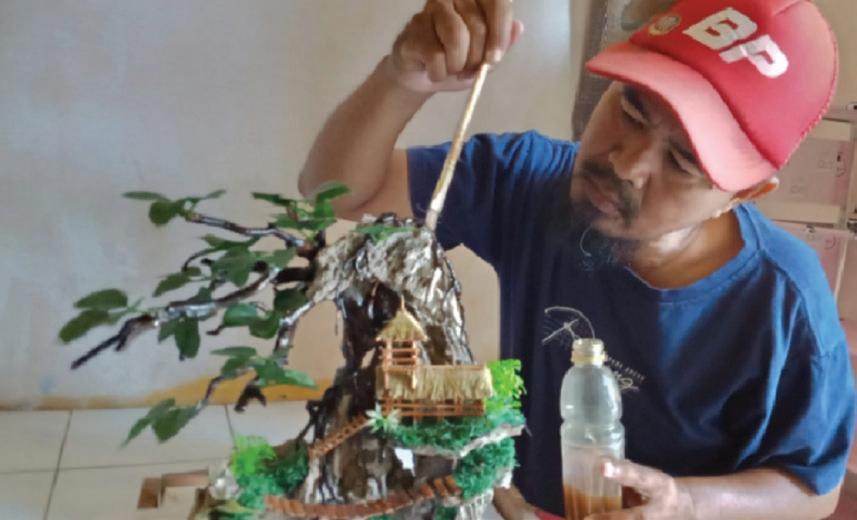 Ditangan pria berusia 40 tahun itu, membuat sebuah gubuk yang berdiri di atas bebatuan yang indah, tanam yang menghijau di tambahan sinaran replika bulan mempercantik karya itu.