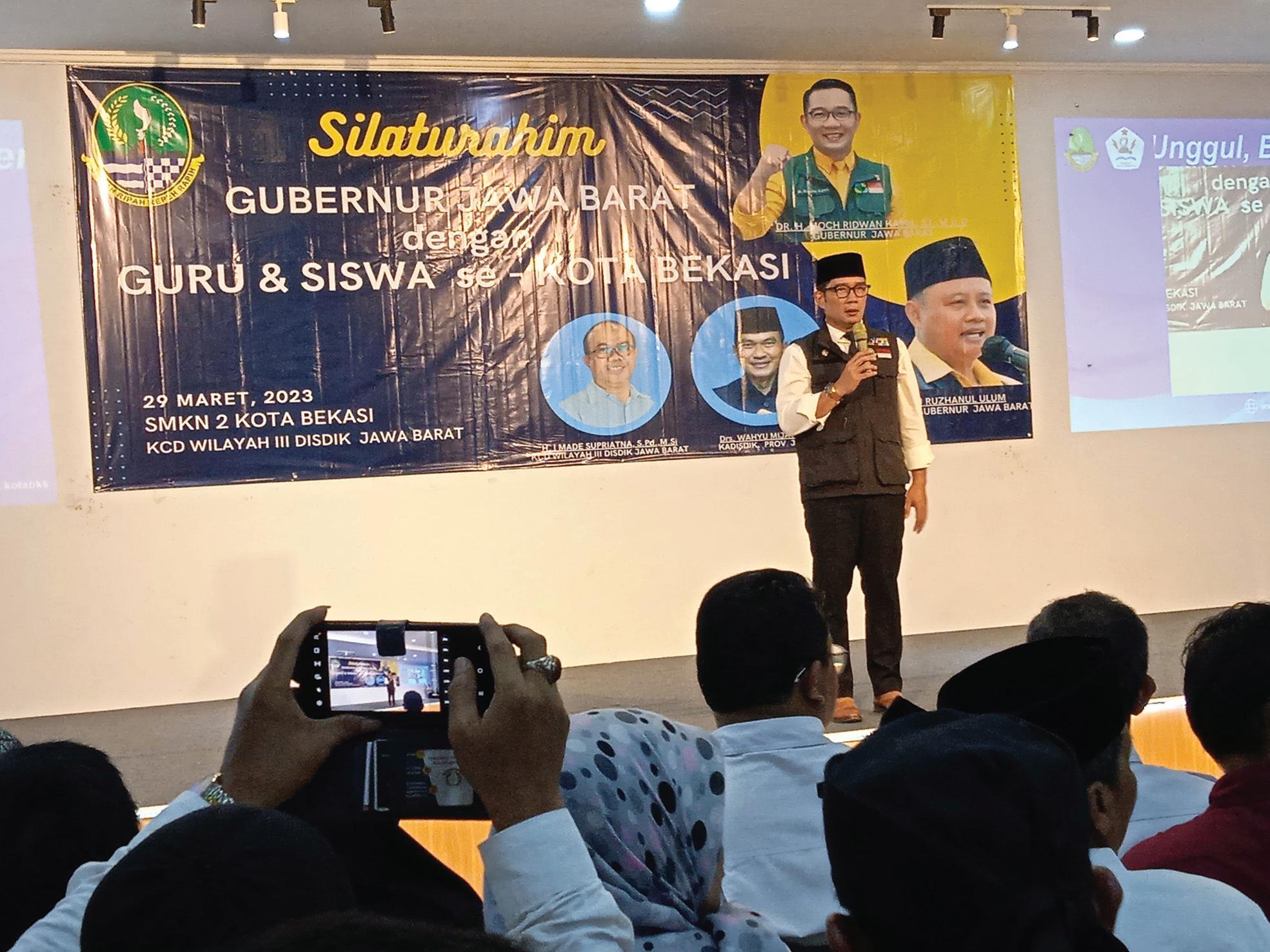 Gubernur Rudwan Kamil saat memberi motivasi pelajar dan guru di SMKN 2 Kota Bekasi, pada Rabu (29/3/2023).