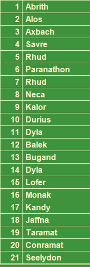 Alle Namen haben etwas gemeinsam und gehören sozusagen in eine "Gruppe" oder Kategorie, vielleicht auch in der MyraPedia. (1) Welche Gruppe findet sich hier? Die Antwort zu Karcanon71 (Bild links) lautete: Der Kaiserliche Rat samt der dort aufgeführten Vertretenden in der Chalkis-Delegation zu den Verhandlungen von Chnumia. Die Antwort zu Karcanon72 (Bild rechts) lautete: Flüsse von Karcanon. (2) welche 21 Namen (die Antwort zu Karcanon 72 findet sich oben in Grün und (3) Welcher Name fehlt sehr offensichtlich? Wer aus den ersten gefundenen Namen die Frage 1 beantworten konnte, hatte es offensichtlich mit Frage 2 und 3 viel leichter. Es gilt eine der „Superzahl“ beim Lotto entprechenden Variante: Nenne als Antwort (3 ) mindestens einen, maximal drei Namen aus (1), welche bei (2) nicht dabei sind. Wenn alle drei richtig sind, zählt das als Gewinn, die erste Person als Hauptgewinn. Falls der von uns gedachte Name dabei ist, gibt es den „Jackpot-Bonus“. Diesmal, als Hinweis, ist bis 04.03.2021 das wichtigste X derselben Entstehung gesucht, das ursprünglich in die selben Kategorie gehörte wie die anderen Begriffe des aktuellen Rätsels.