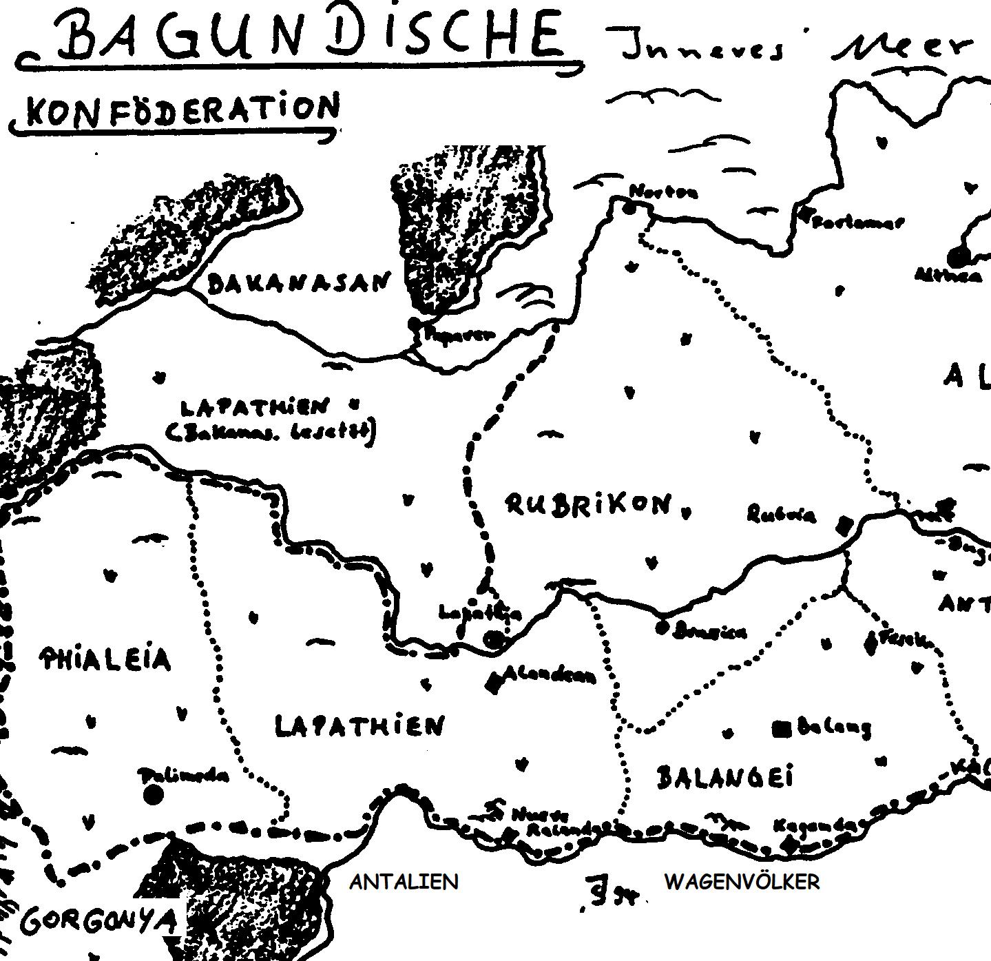 Lapathien umfasst nach der teilweisen Loslösung aus dem Vereinigten Königreich von Bagunda heute den größeren Teil des früheren bagundischen Erzherzogtums Lapathien. Zuvor war es lange Zeit zwischen Bagunda und Bakanasan umstritten; schließlich wurde es auch von der Purpurnen Bruderschaft angegriffen. Dabei fiel der damalige, eng mit dem bagundischen Lordkanzler Badulla befreundete Erzherzog Thomas Kyrill.