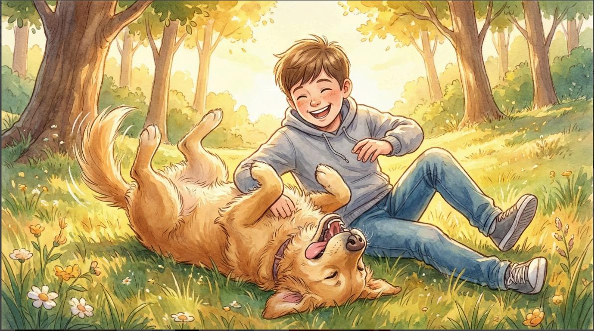 We chase and we tumble in the soft afternoon sun, two goofy buddies having endless fun.