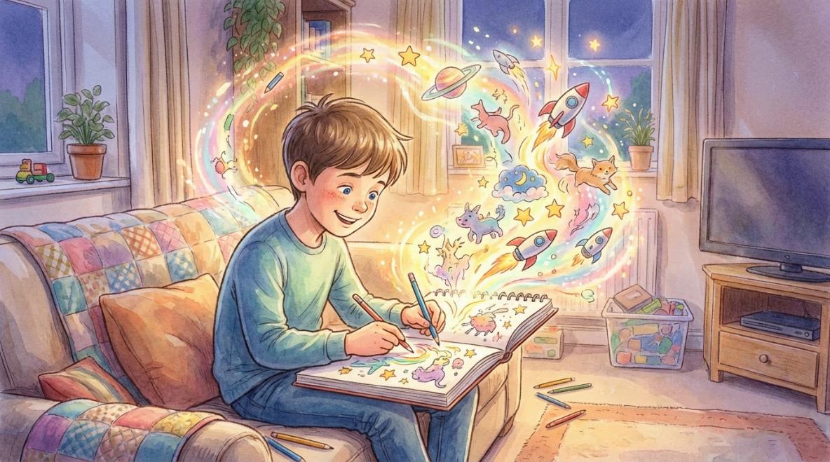 With doodles and scribbles, my ideas take flight, a whole brand-new world appears in bright light!