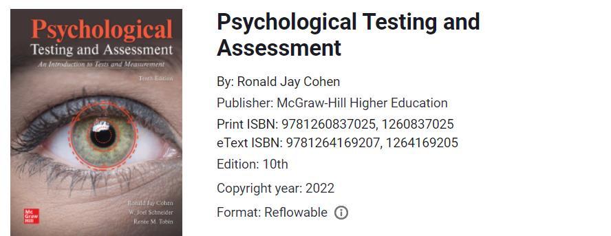 Cohen, R. J., & Swerdik, M. E. (2012). Psychological testing and assessment: An introduction to tests and measurement (8th ed.). New York, NY: McGraw-Hill.