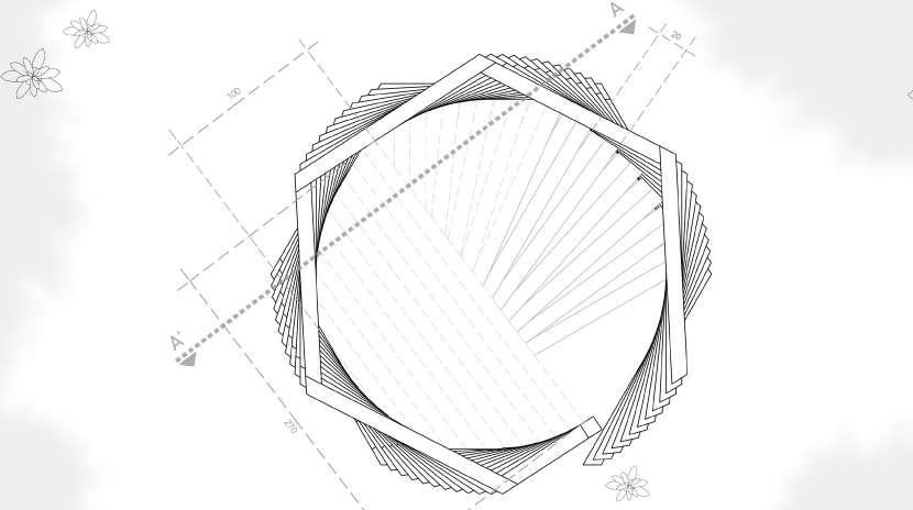 Le spectateur s’avance et découvre un hexagone vertical, l’ouverture en biais invite celui-ci à trouver une façon de pénétrer dans la cabane.