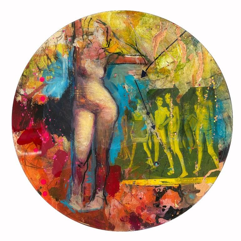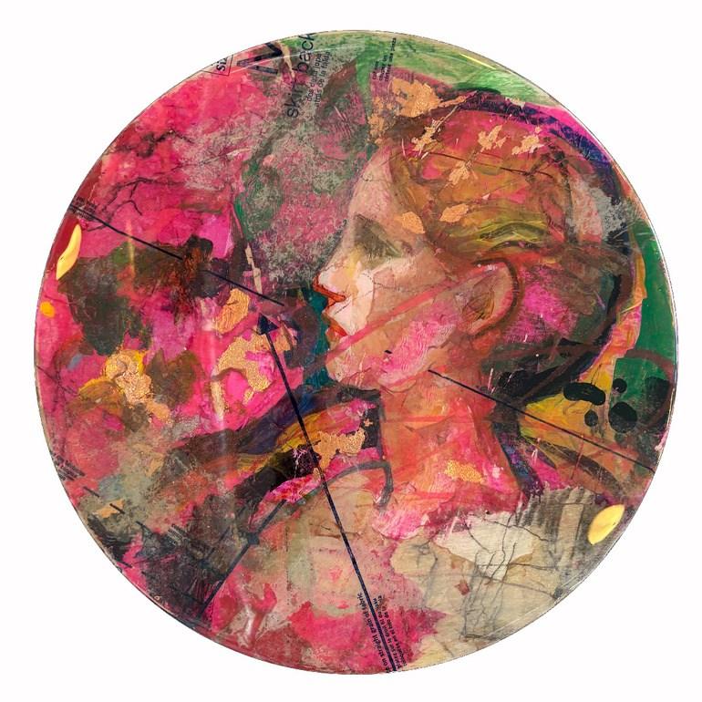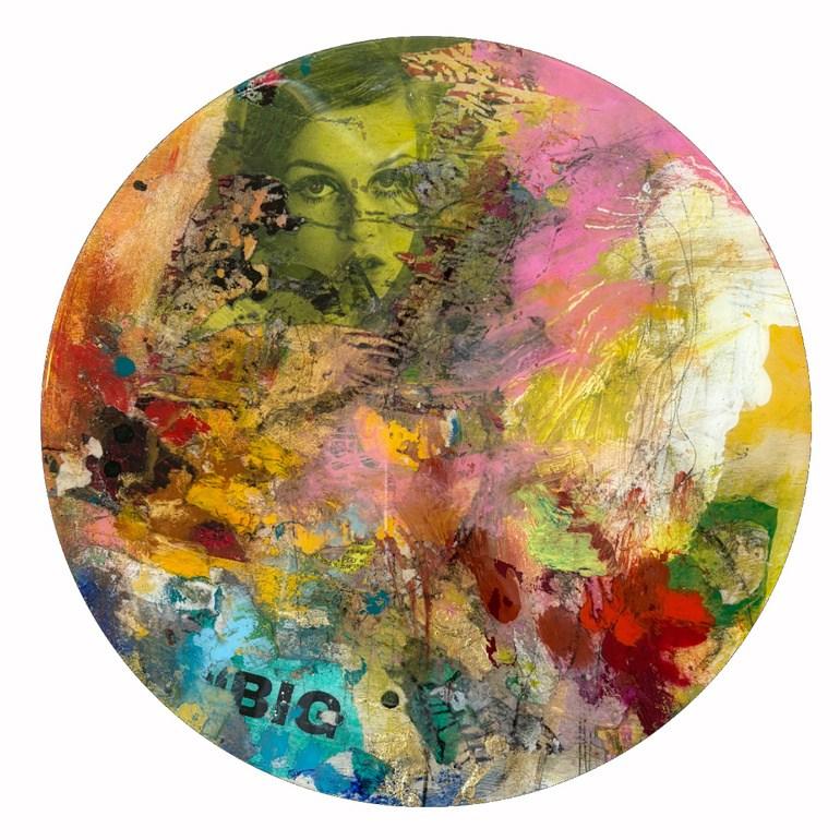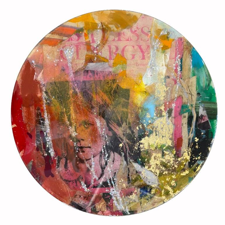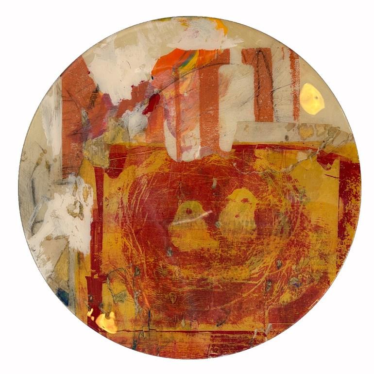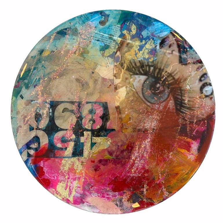 Acrylic paint, gel prints, gold leaf, and collage materials under resin, on art board, 16 inches round