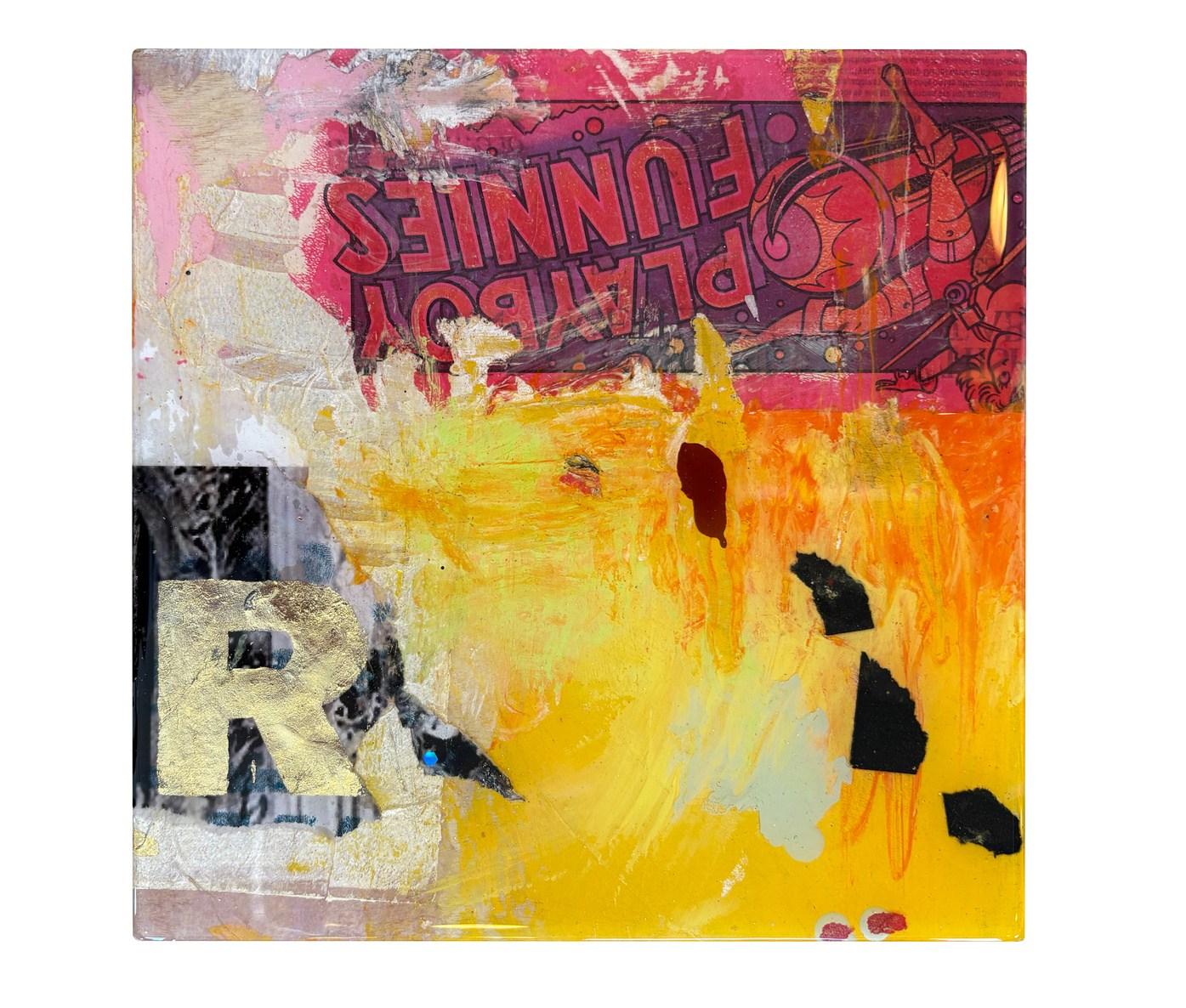 Acrylic paint, gel prints, gold leaf, and collage materials under resin, on art board, 6 x 6 x 1.5 inches