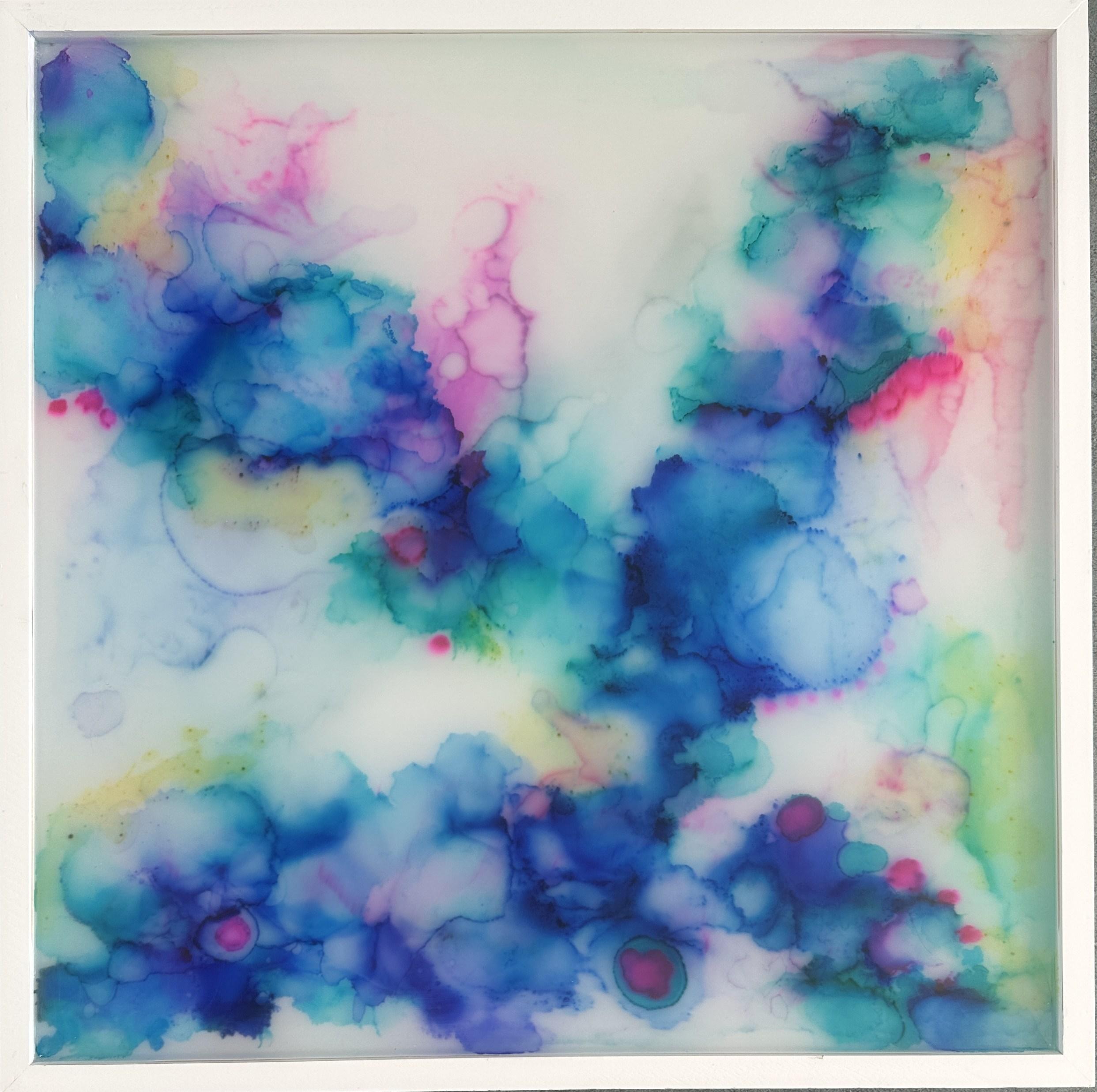 Resin, alcohol ink, wax, in wood frame, 20.5 x 20.5 inches