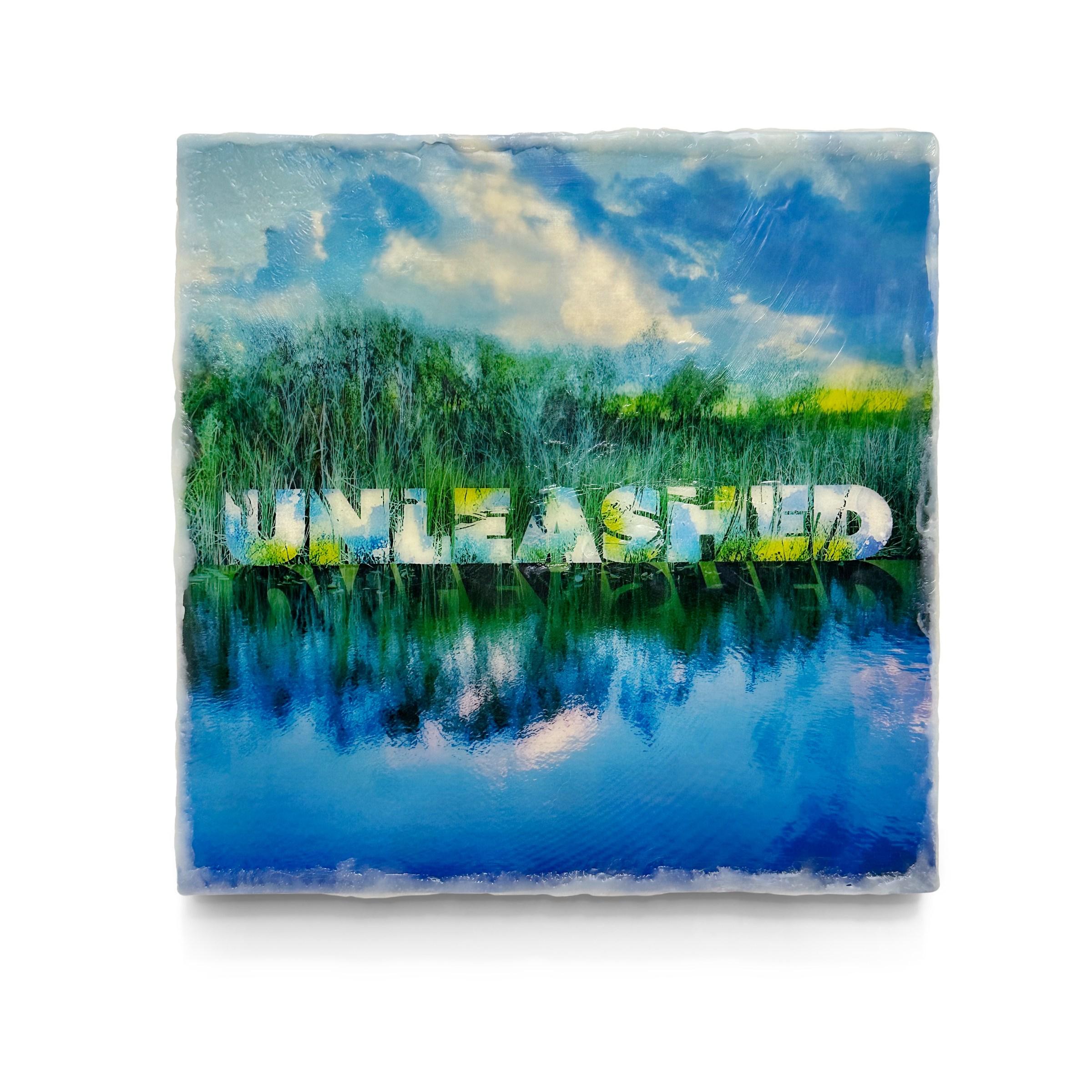 CheckIn/CheckOutis an ongoing series of conceptual digital art collages wherein I juxtapose charged, provocative words from contemporary discourse with calming, nature based imagery reflecting a need for balance and serenity in the era of doom scrolling, click bait and rabbit holes. I select words that I find personally triggering as they’re repeated across news headlines and social media, and composite them into digitally altered environments to diffuse their intensity. Letters are individually edited to blend into scenes as partially camouflaged while remaining present. Printed composites are fused to wood panels with encaustic wax which is manipulated to achieve subtle opacities and translucence.