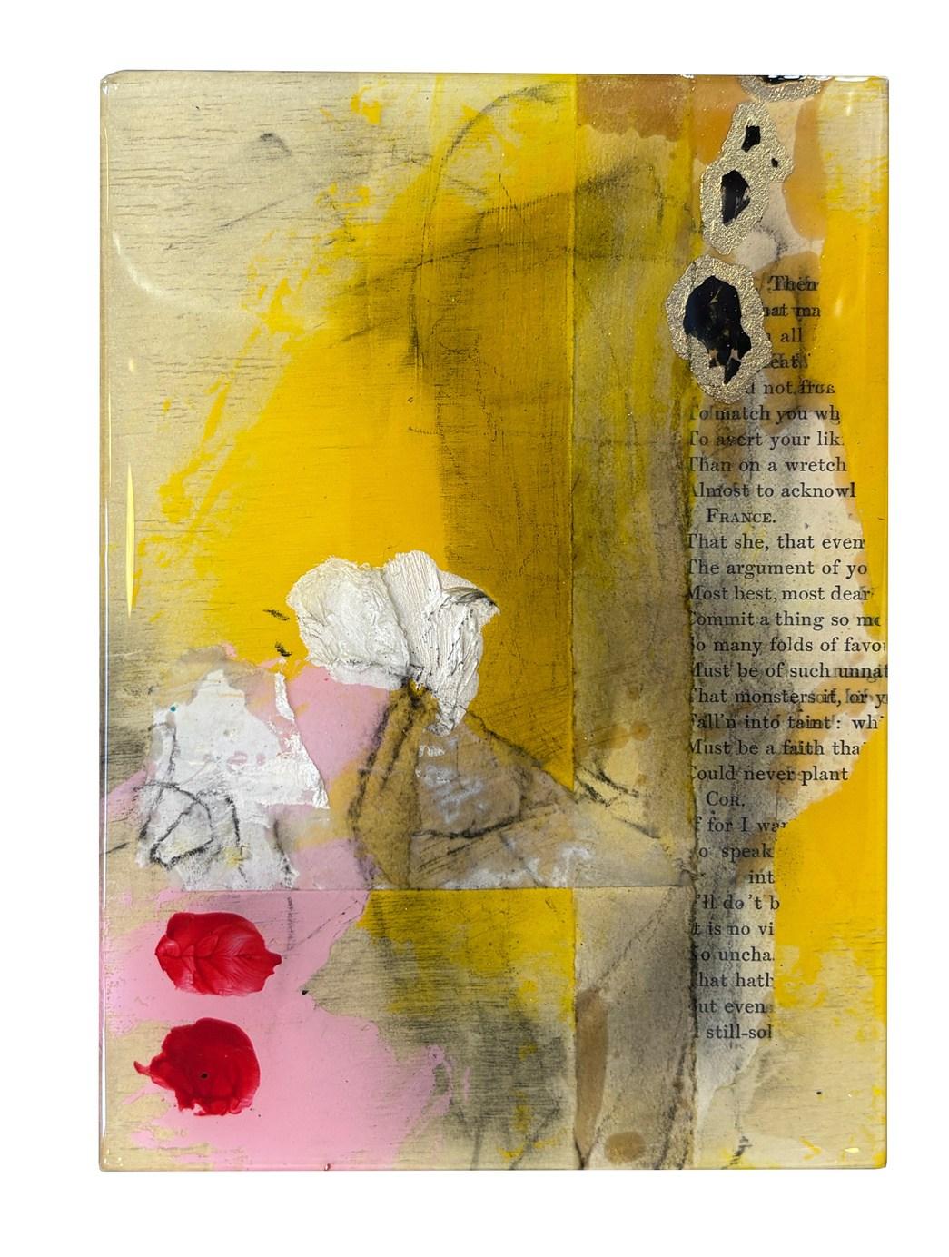 Acrylic paint, gel prints, gold leaf, and collage materials under resin, on art board, 6 x 4 x 1 inches
