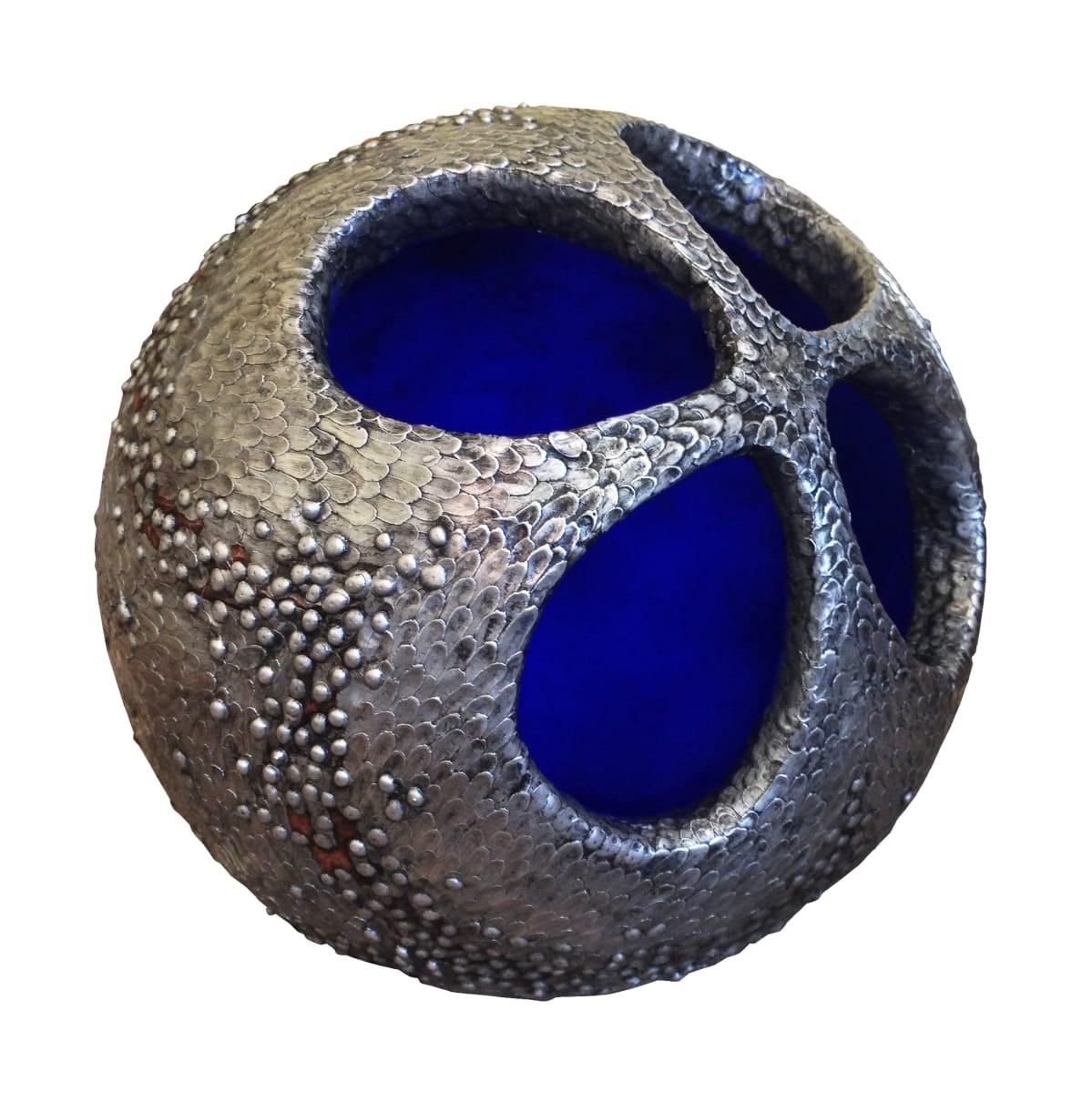 The surfaces of my soldered metal pieces draw inspiration from unexpectedly diverse sources typically a mash-up of California native flora and Medieval weaponry though I’ve also tapped into the organic patterns of coral, fungus, and lava flows for fresh ideas. When building these works, I begin by covering the areas I want to solder with thick copper foil. Next, I lay down the first layer of texture in silver solder like painting with molten metal. I add dimension to the work by placing beads of solder to create depth and contrast. The pieces are covered with a rich black patina, and burnished with steel wool to bring out shining highlights on the raised peaks, while leaving dark in the valleys.