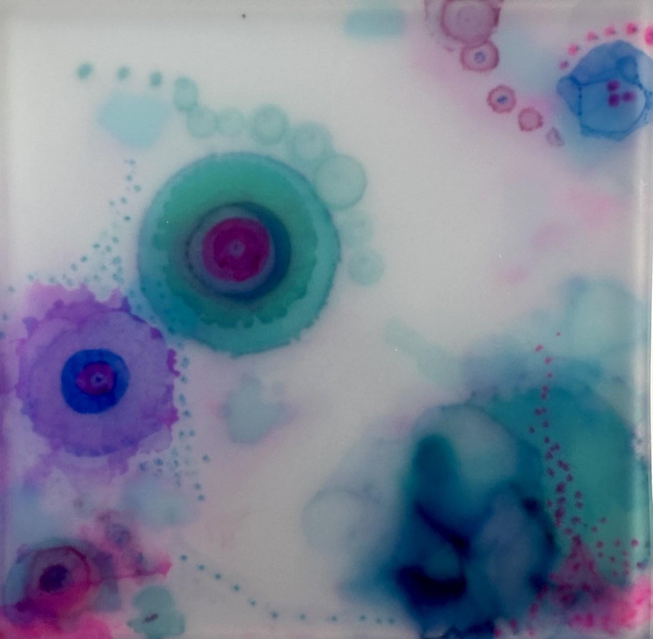 Resin, alcohol ink, and wax on canvas, 6 x 6 inches each