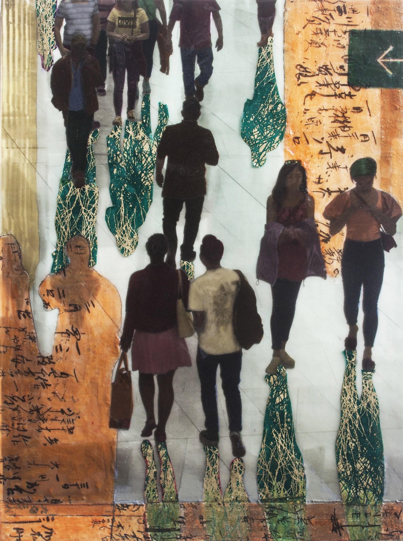 Photo images, oil, decorative text paper, resin surface on wood panels, 26 x 30 x 2 inches