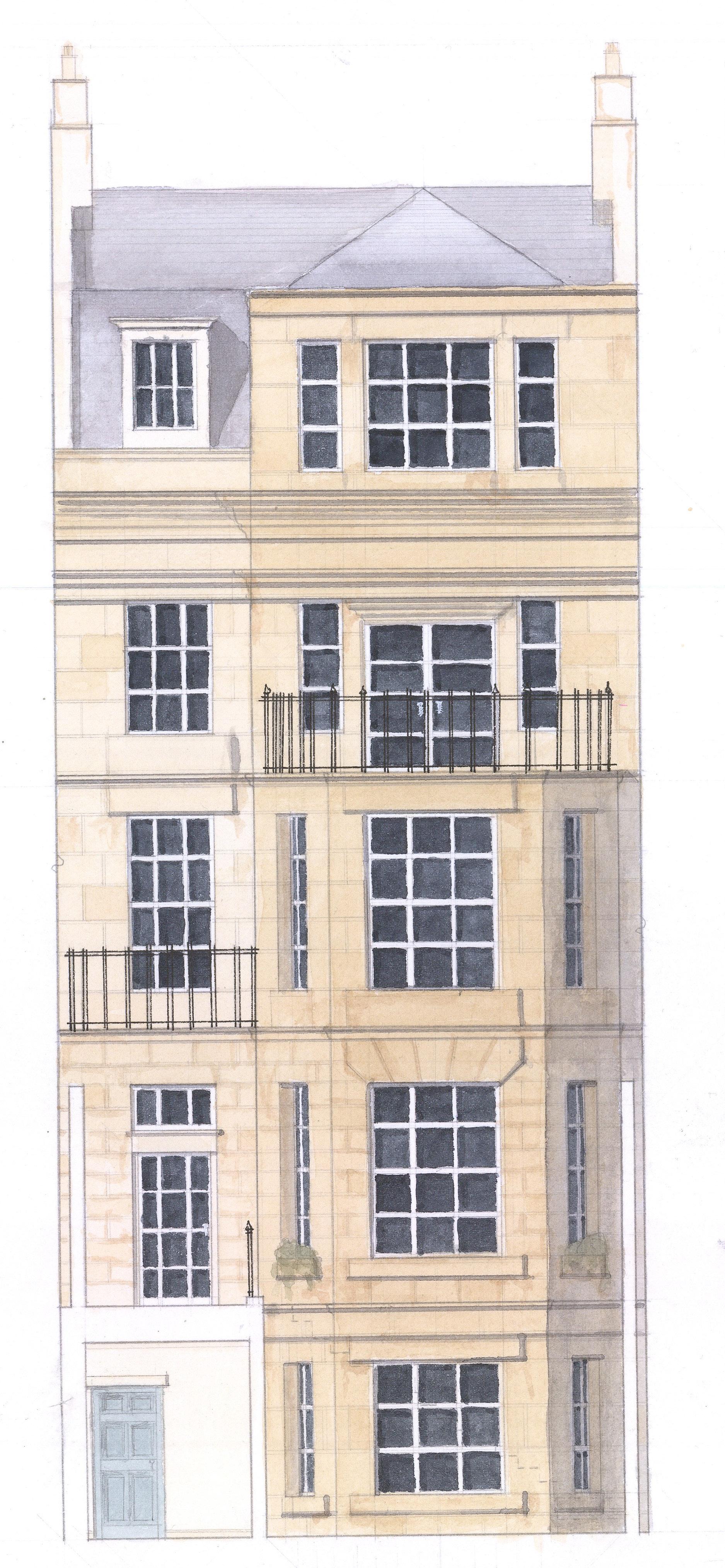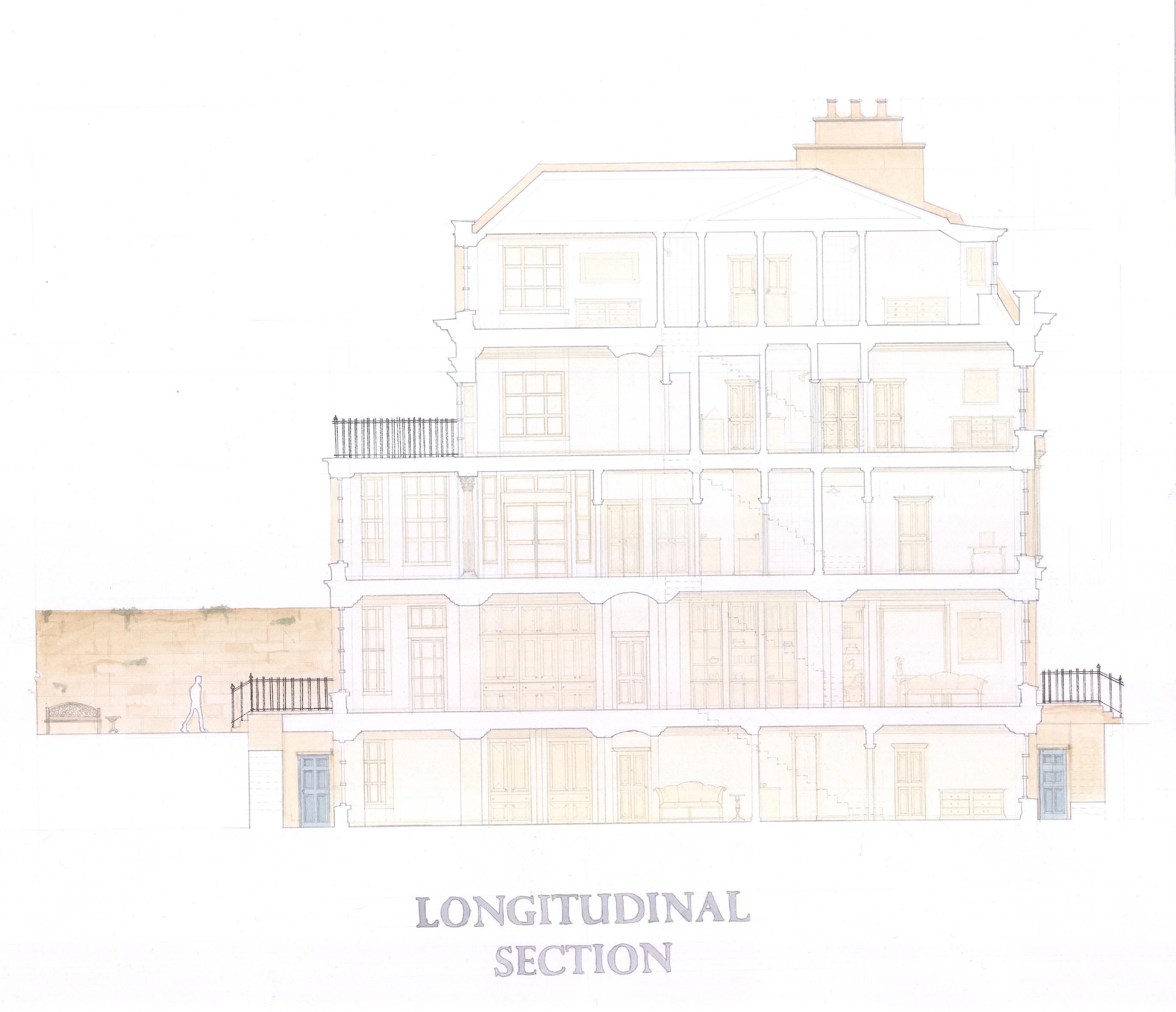 This multi-story townhouse was designed to be placed within a new block on an undeveloped part of Bath, UK. The project began with a masterplan for the area that would reinvigorate a run-down sports area beside the River Avon into a new neighborhood that would follow the typology and character of historical Bath. The final townhouse design includes a five-story plan, adjoining garden and a garage with multiple terrace spaces throughout the home.