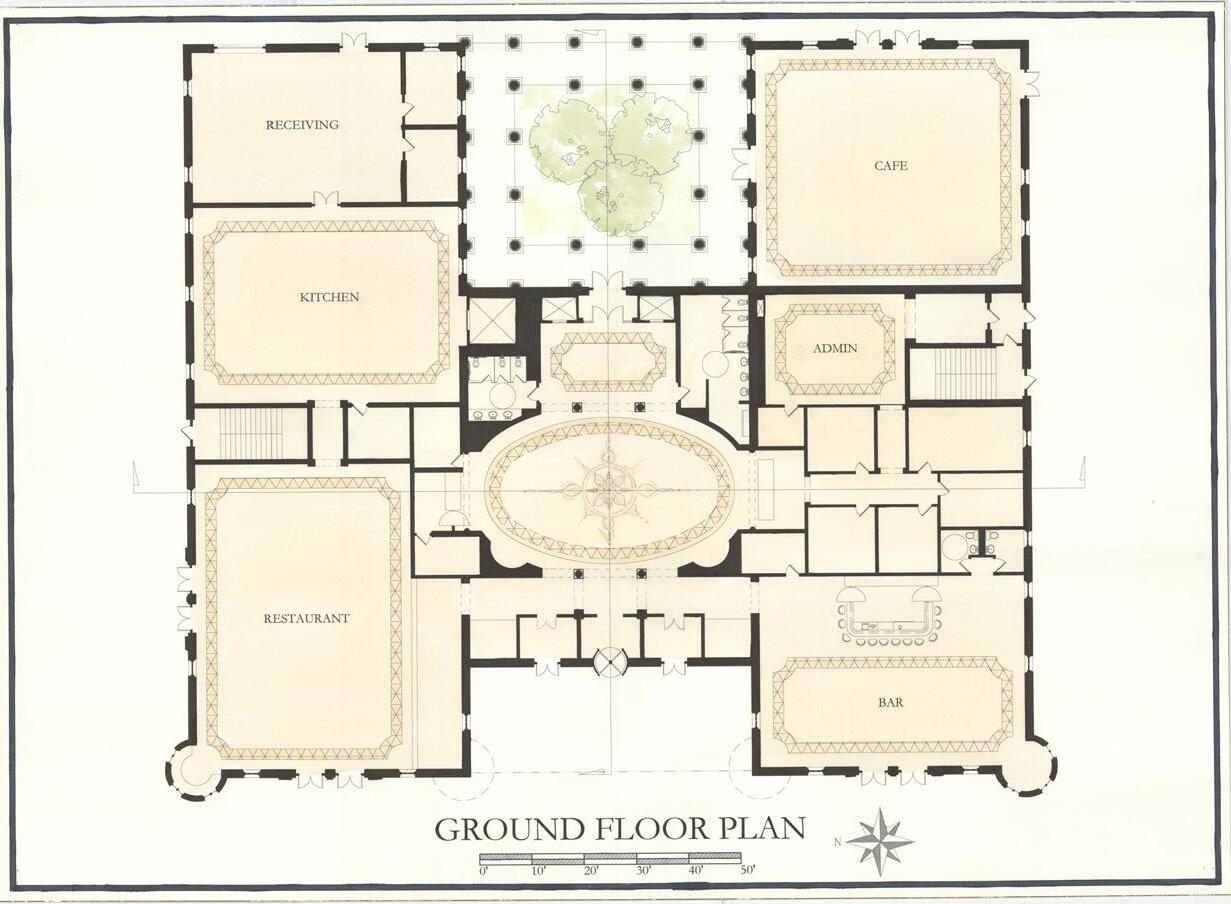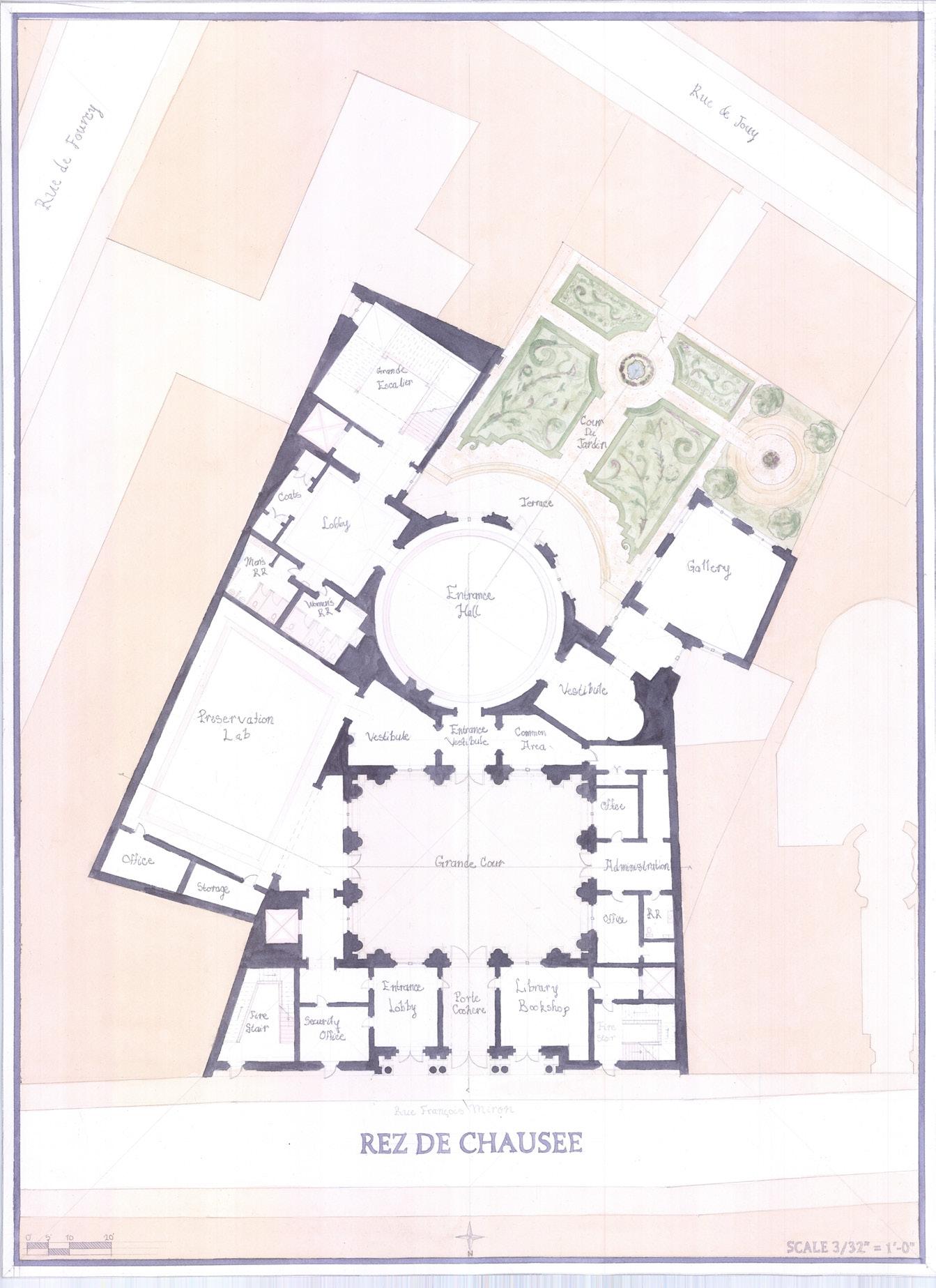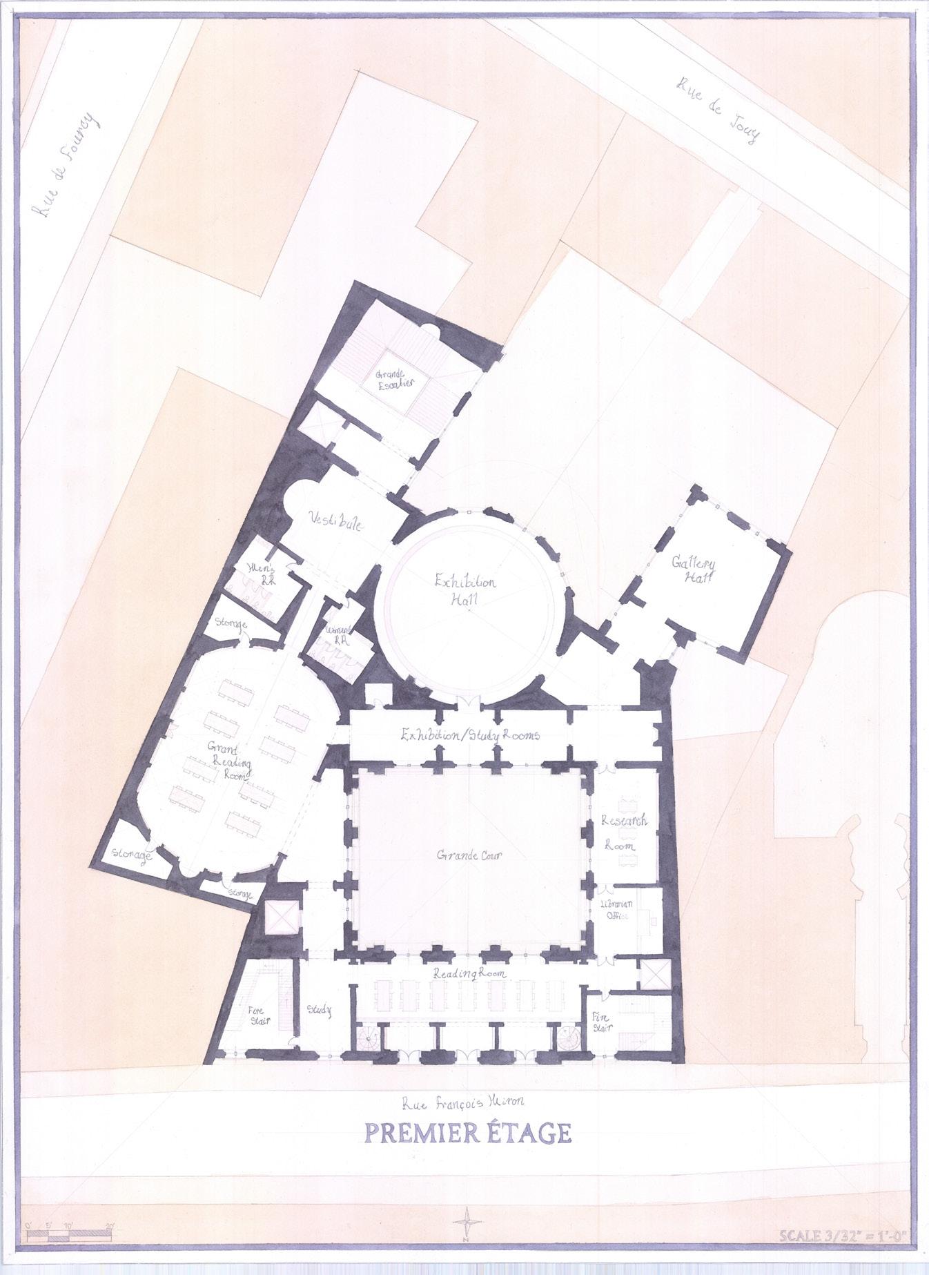The primary goal of the design was to develop a library and archive for Paris that would follow the Paris hotel typology and fit well into the historic city. Throughout the design, I was challenged with having an irregularly shaped plot and learned to utilize hinges and axes into my library and sequential courtyards and gardens. The library project taught me about the use of hierarchy in spaces, levels of privacy in a public space, and how to design with respect to existing structures.