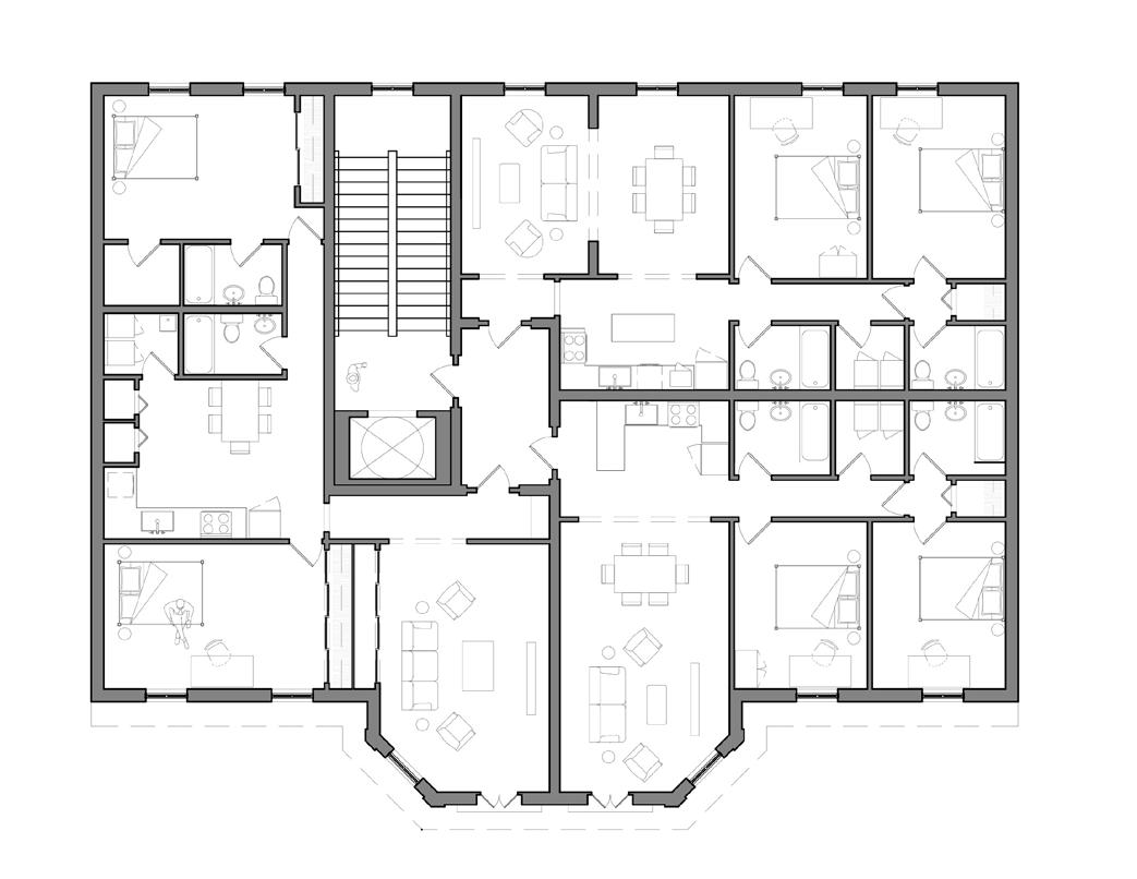 The building and its mixed-use surroundings aim to reinvigorate Market St. into a safe and engaging place to live, shop, eat, and enjoy the company of others. In addition, this project acted as a study for the city to explore possible code alterations. This residential building poses an opportunity to increase density while maintaining character and safety of the public.