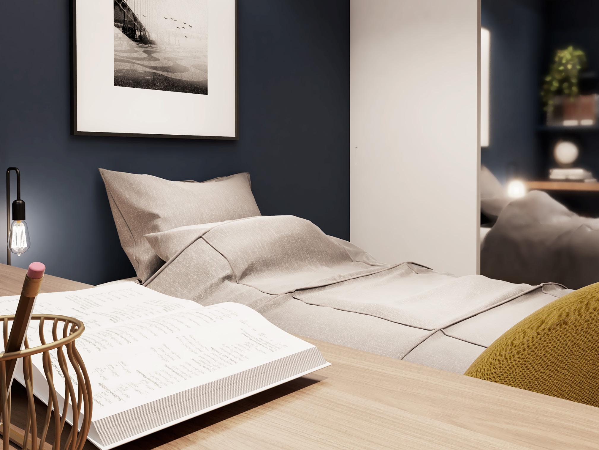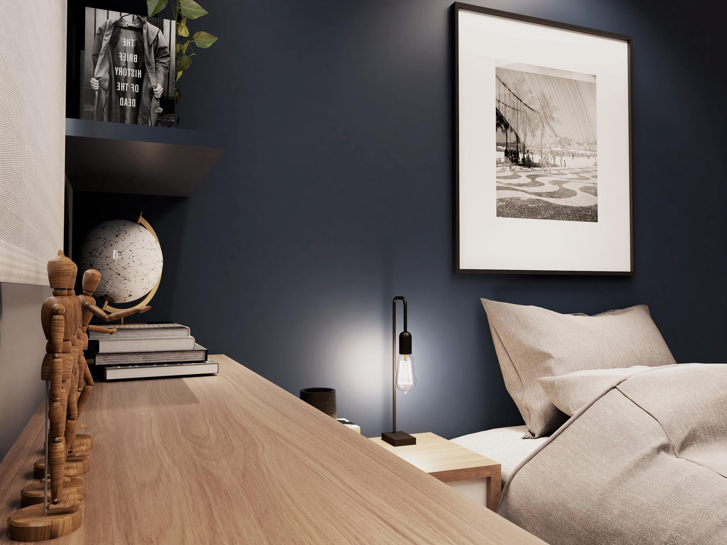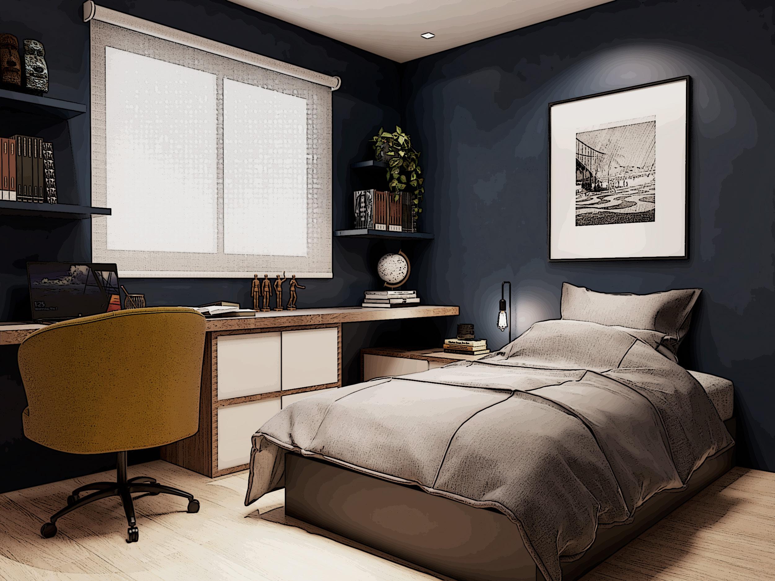 Proyecto desarrollado de manera independiente para un cliente joven, el objetivo era lograr un espacio que le otorgara privacidad y al mismo tiempo fuera acogedor. Los colores elegidos dentro de la paleta reflejan la personalidad del usuario, por lo que se aplicó colores complementarios saturados al negro.
