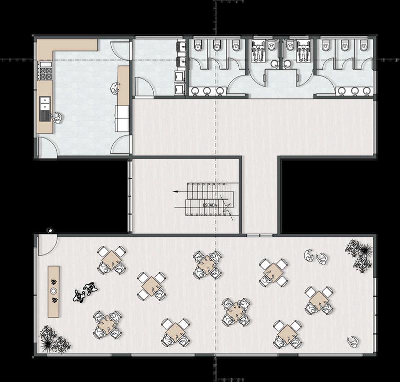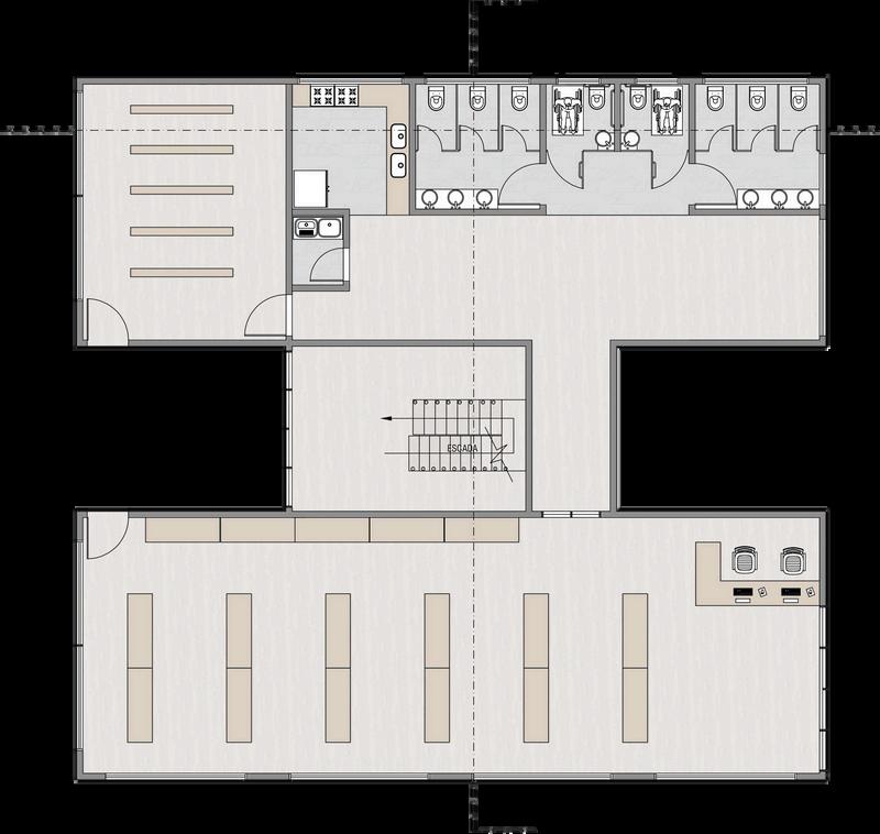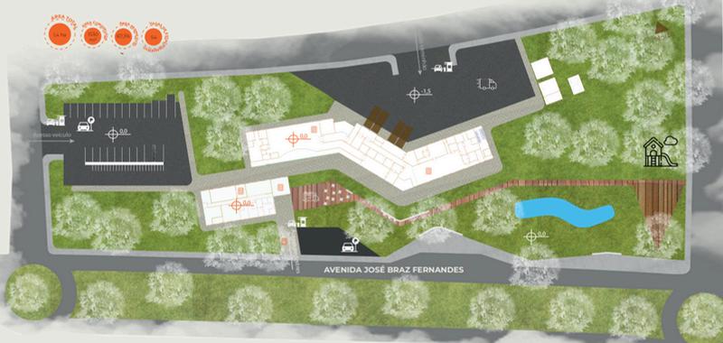 Pavimento térreo com uso misto, variando em: residência PCD, galeria comercial, espaço multiuso e estacionamento