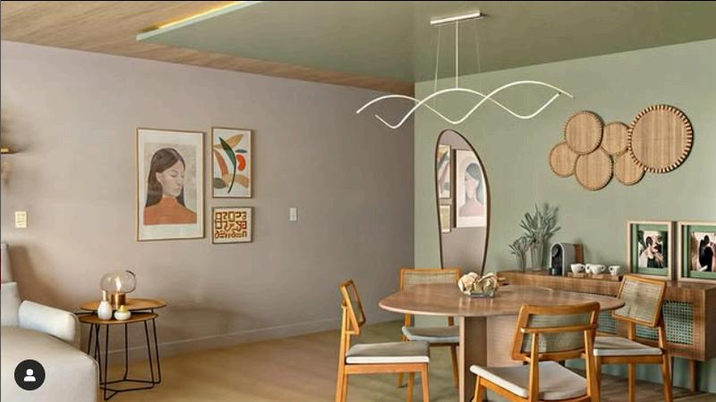 A sala trás a madeira no forro,piso e mobiliário, com o intuito de tornar o ambiente aconchegante e mais acolhedor