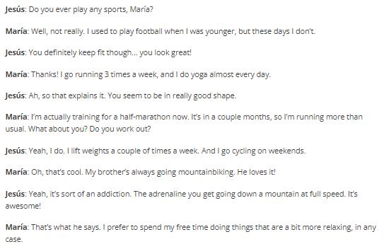 Production (post): Students will be organized in groups of two. One of them will ask the other what he does in her spare time, and the other person will answer correctly. After this, they will exchange roles.