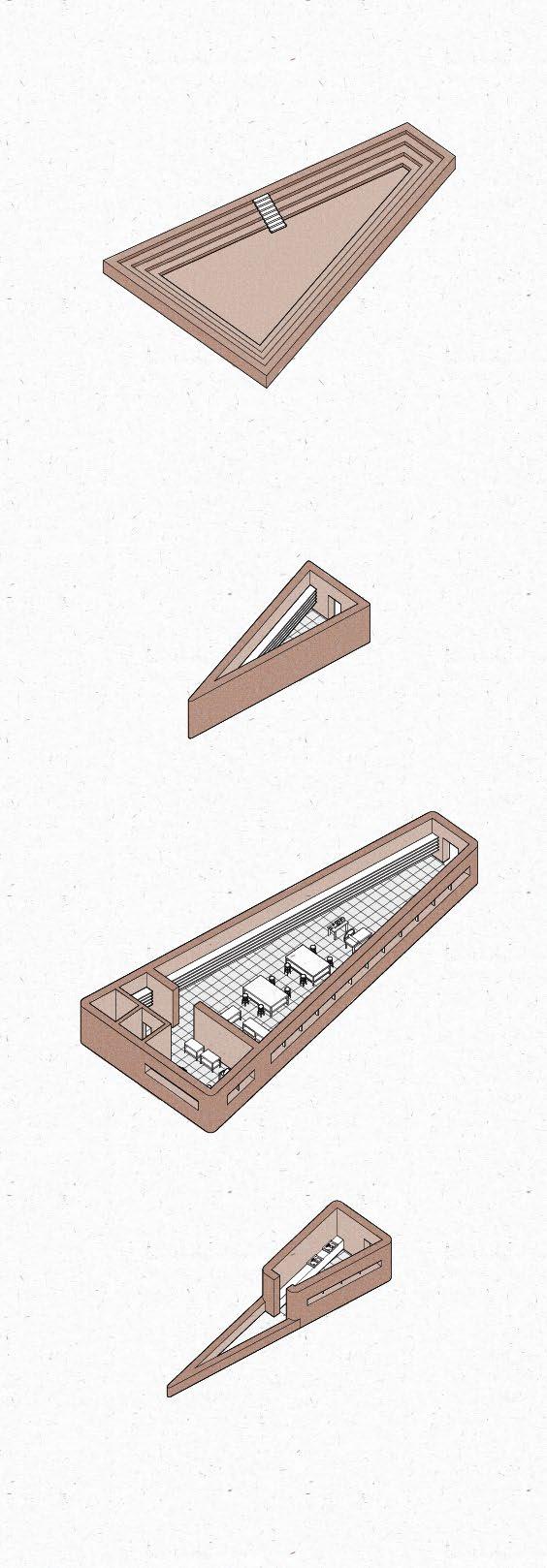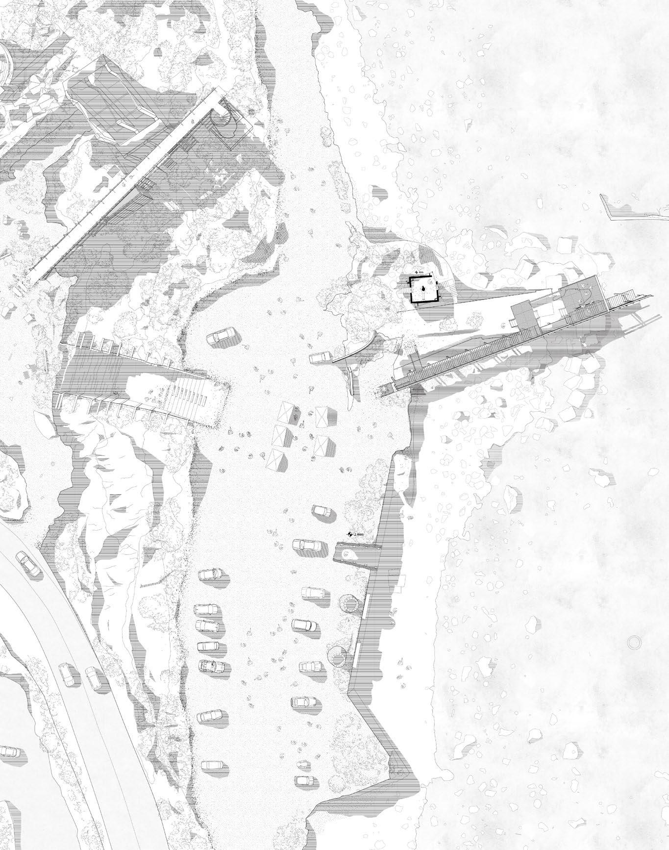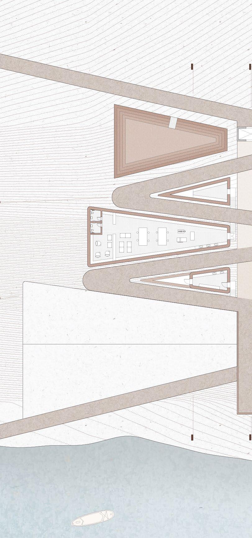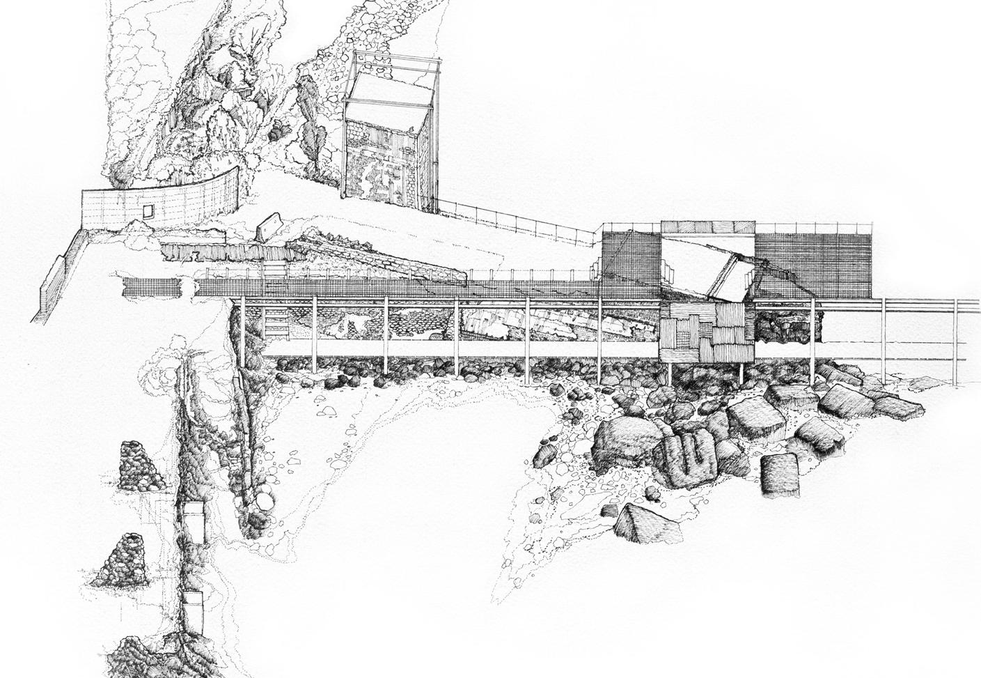 This project is conceptualized as four interventions that stitch together the three plateaus found on an abandonded iron mine in Rio Marina. The CATWALK envelopes existing RUINS from the mining infrastructure to serve as a new facade of this INDUSTRIAL PARK, made up of wooden scaffolding and textile drapes. This provides a base infrastructure for the public to decide how to use this area of the park and what needs to be added/removed to adapt to their needs. The new DOCK sits atop and askew the previous dock to accommodate for the informal fishing activities that occur on this abandoned site. These two interventions serve as the stereotomic interventions, mimicking the existing mining structures while also looking at toward the water. The two stereotomic interventions are the AMPHITHEATRE and the HIDING HOLES. The amphitheatre carves away on the steep wall of the site, forcing viewers to look and descend into the land, which is part of the island’s long history of MINING. On the other hand, the hiding holes provide shade for beach goers, while forcing them to look straight into the ocean, as FISHING and water are also part of the island’s history.