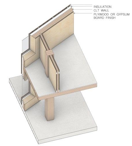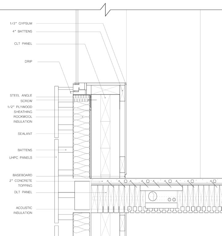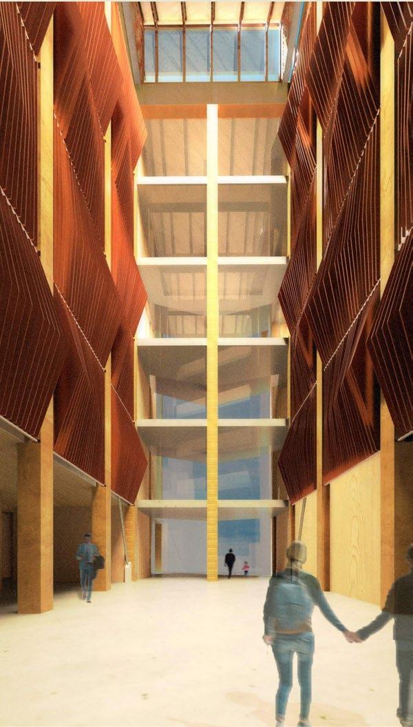 The project also strives to highlight MATERIALITY and seamlessness by taking full advantage of mass timber technologies. MEP services, such as soundproofing, heating, insulation and plumbing, are embedded into the dowel-laminated timber (DLT) panels. Additionally, where structural and mechanical elements on the interior cannot be hidden, they are highly-designed ORNAMENTS of space. For instance, the rib-like copper fins in the atrium are designed to reflect light and double as mechanically operable smoke-screens. Likewise, the skylgihts in the atrium allow light to enter the space, but also create an opportunity for PASSIVE VENTILATION