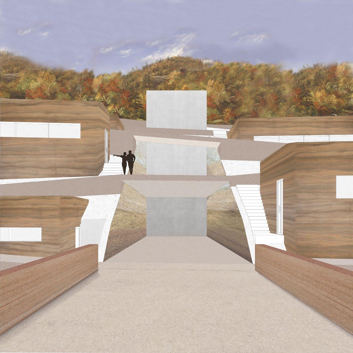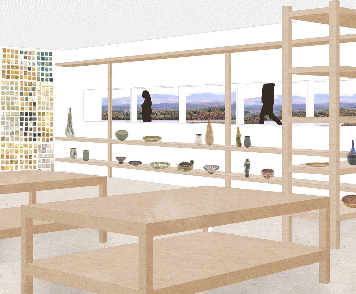The design is conceptualized as a WINDING PROMENADE-inspired by neighboring winding roads-- with EMBEDDED VOLUMES that create space for ceramic production. The building begins at the mining stage of clay production, then follows through studio spaces and culminates in open viewsheds that look toward the Hudson River and the Catskill landscape. The project utilizes rammed earth construction to explore the use of the ground as a material for SMALL SCALE PRODUCTION (like ceramics) and LARGE SCALE PRODUCTION (like architecture) simultaneously. The material nature of the project also creates OPPORTUNITIES FOR EXPANSION as needed by the users.