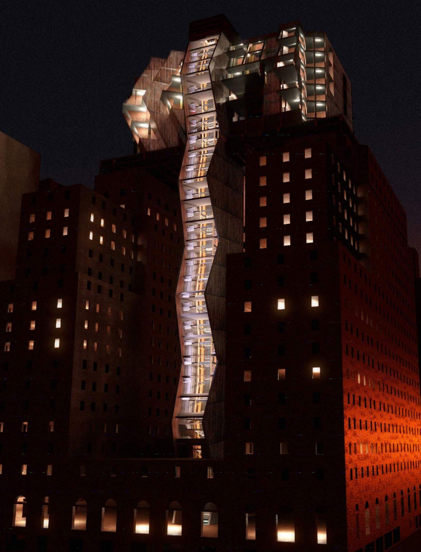 This addition to the Roosevelt Hotel in Midtown Manhattan offers an alternative to high rise construction in the urban setting using a combination of MASS TIMBER techonologies and inventive formal geometries. The Spine’s form derives from experimentation with spacefilling POLYHEDRA (i.e. bilateral elongated fastigum) and inspiration from brutalist architectures of mass, sculpture, and textural diversity. The resulting design is multifaced in material and form. By manipulating this polyhedron, a naturally additive shape, the formal design of the project is able to respond to selected views of the city, as well as its climactic conditions.