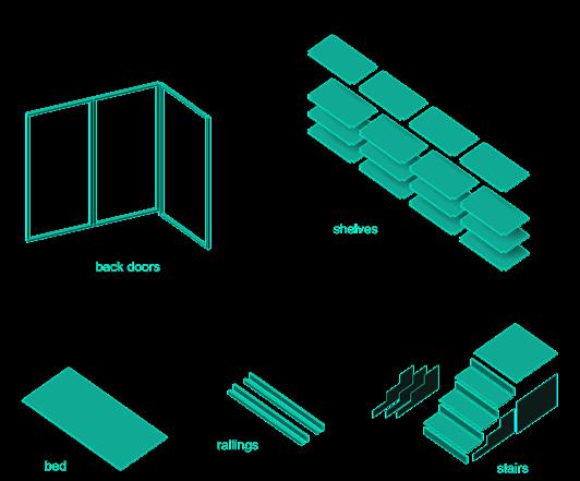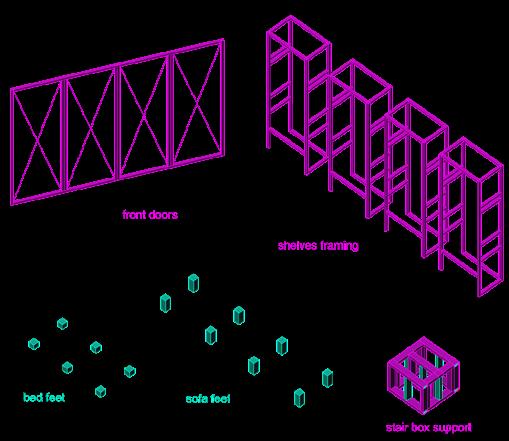 The bottom modules serve as a repository for the objects in their factorysealed condition. The prefabricated PROTOTYPES are docked in the basement where they are stored, sanitized, charged, and protected.