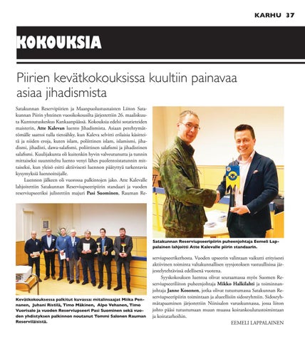 KOKOUKSIA 2015 Piirien kevätkokouksissa kuultiin painavaa asiaa jihadismista Satakunnan Reservipiirien ja Maanpuolustusnaisten Liiton Satakunnan Piirin yhteinen vuosikokousilta järjestettiin 26. maaliskuuta Kuntoutuskeskus Kankaanpäässä. Kokouksia edelsi sotatieteiden maisterin, Atte Kalevan luento Jihadismista. Asiaan perehtymättömälle saattoi tulla tietoähky, kun Kaleva selvitti erilaisia käsitteitä ja niiden eroja, kuten islam, poliittinen islam, islamismi, jihadismi, jihadisti, dawa-salafismi, poliittinen salafismi ja jihadistinen salafismi. Kuulijakunta oli kuitenkin hyvin valveutunutta ja tunnin mittaiseksi suunniteltu luento venyi lähes puolentoistatunnin mittaiseksi, kun yleisö esitti aktiivisesti luennon päätyttyä tarkentavia kysymyksiä luennoitsijalle. Luennon jälkeen oli vuorossa palkintojen jako. Atte Kalevalle lahjoitettiin Satakunnan Reserviupseeripiirin standaari ja vuoden reserviupseeriksi julistettiin majuri Pasi Suominen, Rauman Re-