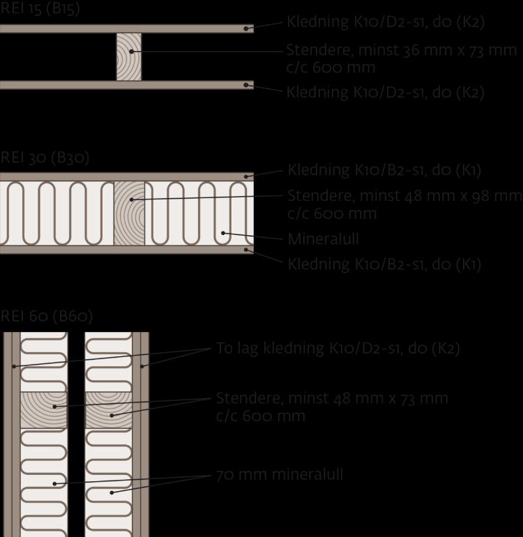Eksempel på hva som er nødvendig for å kunne oppnå brannmotstand på 15, 30 og 60 minutter med en ordinær trevegg.
