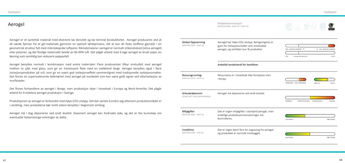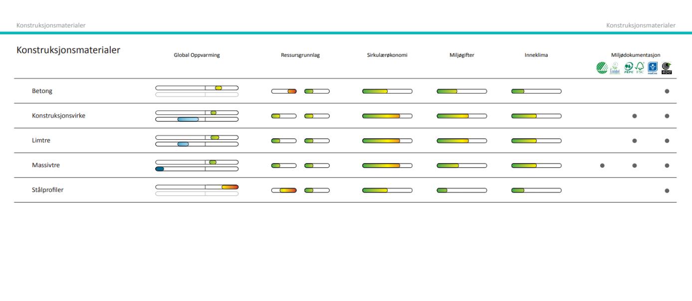 Guiden deler inn de ulike materialene i 6 forskjellige kategorier; Global oppvarming, Ressursgrunnlag, Sirkulerøkonomi, Miljøgifter, Inneklima og Miljødokumentasjon.