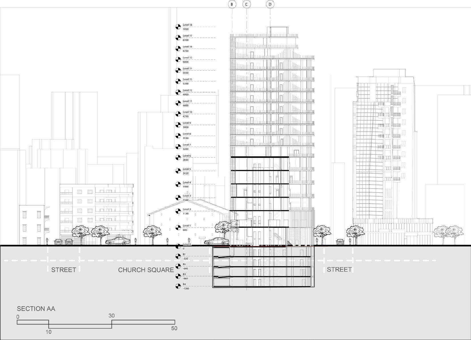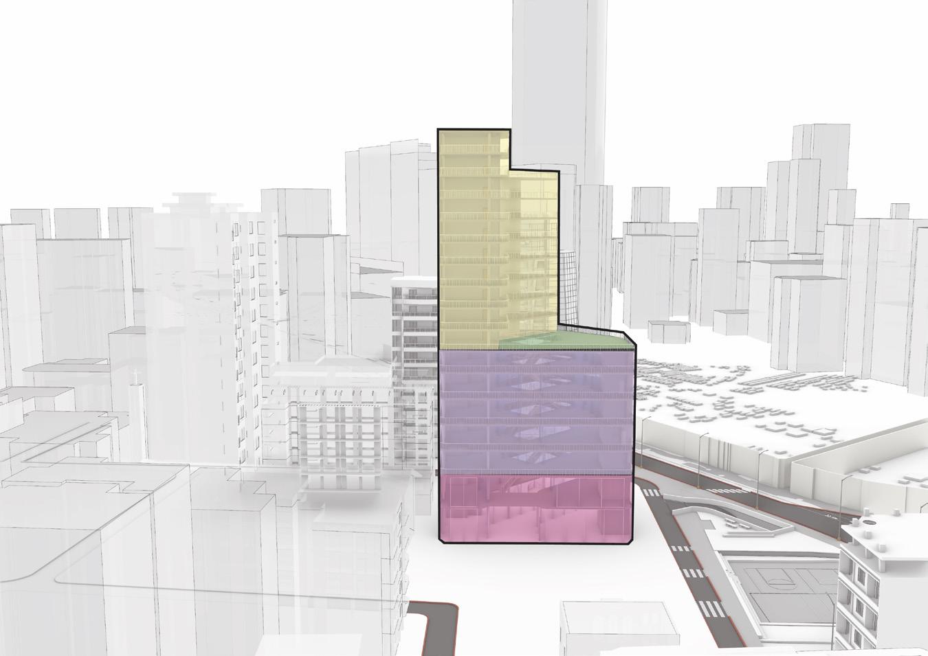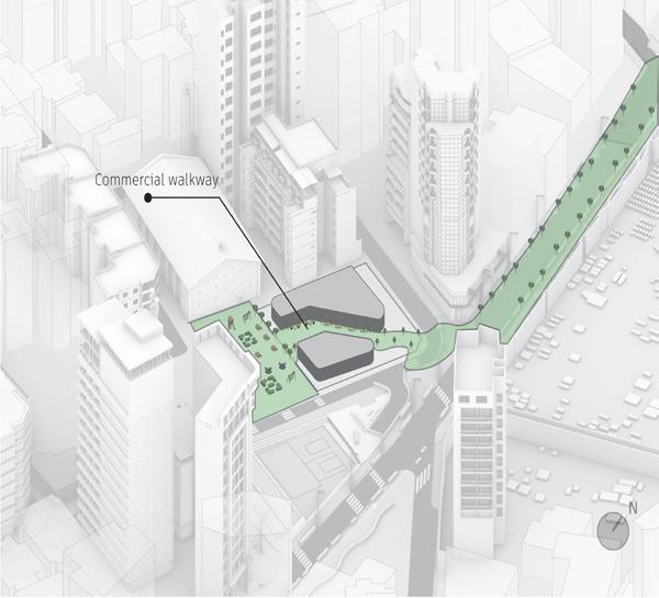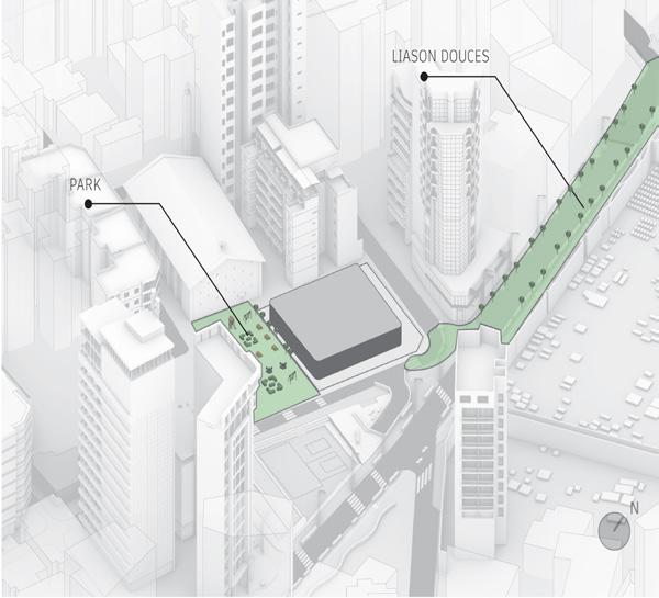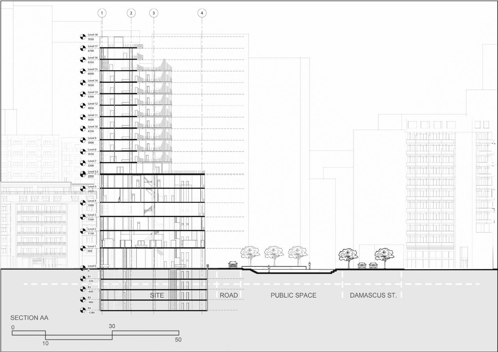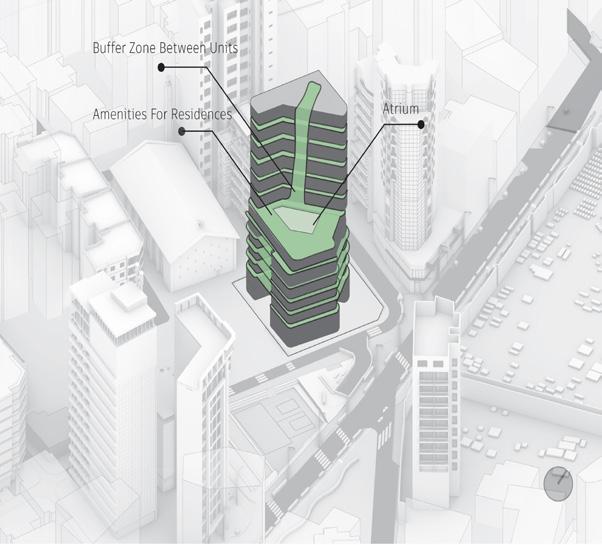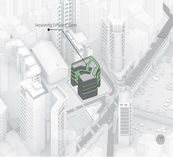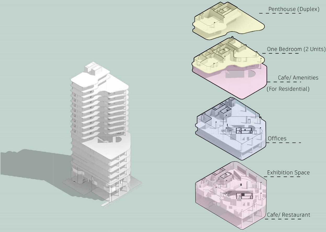 This project was done for our 4th year comprehensive studio. We were asked to design a multipurpose tower on an empty plot along the “Green Line” strip. My aim was to create a tower that connects two green areas from across the plot and somehow extend it through the tower creating both indoor and outdoor areas for social friction. Instead of having a tower that is alienated from the neighborhood, I wanted my project to resonate with the surroundings and provide a space where everyone is welcome to benefit from while also maintaining the privacy of residents and office workers.