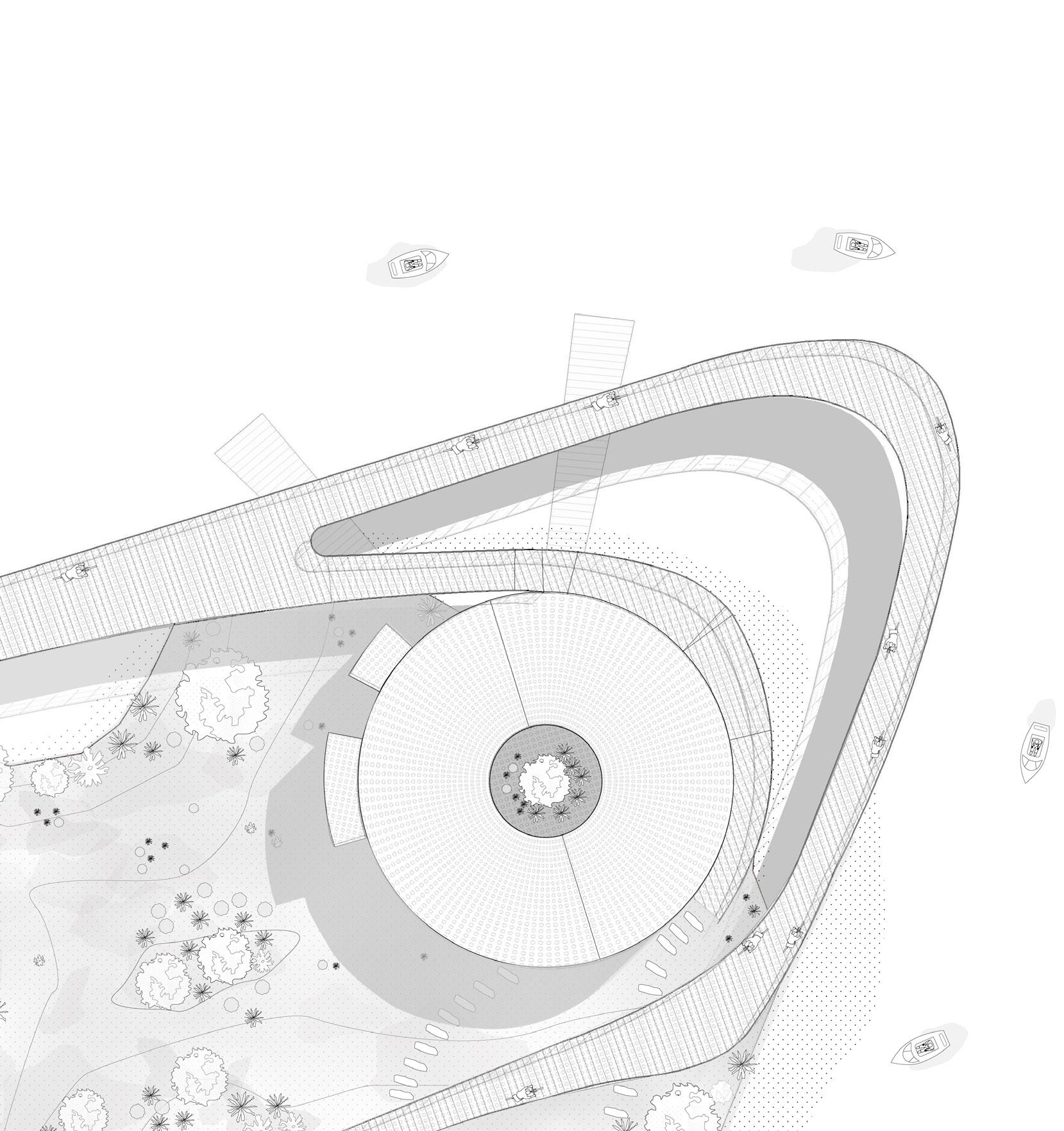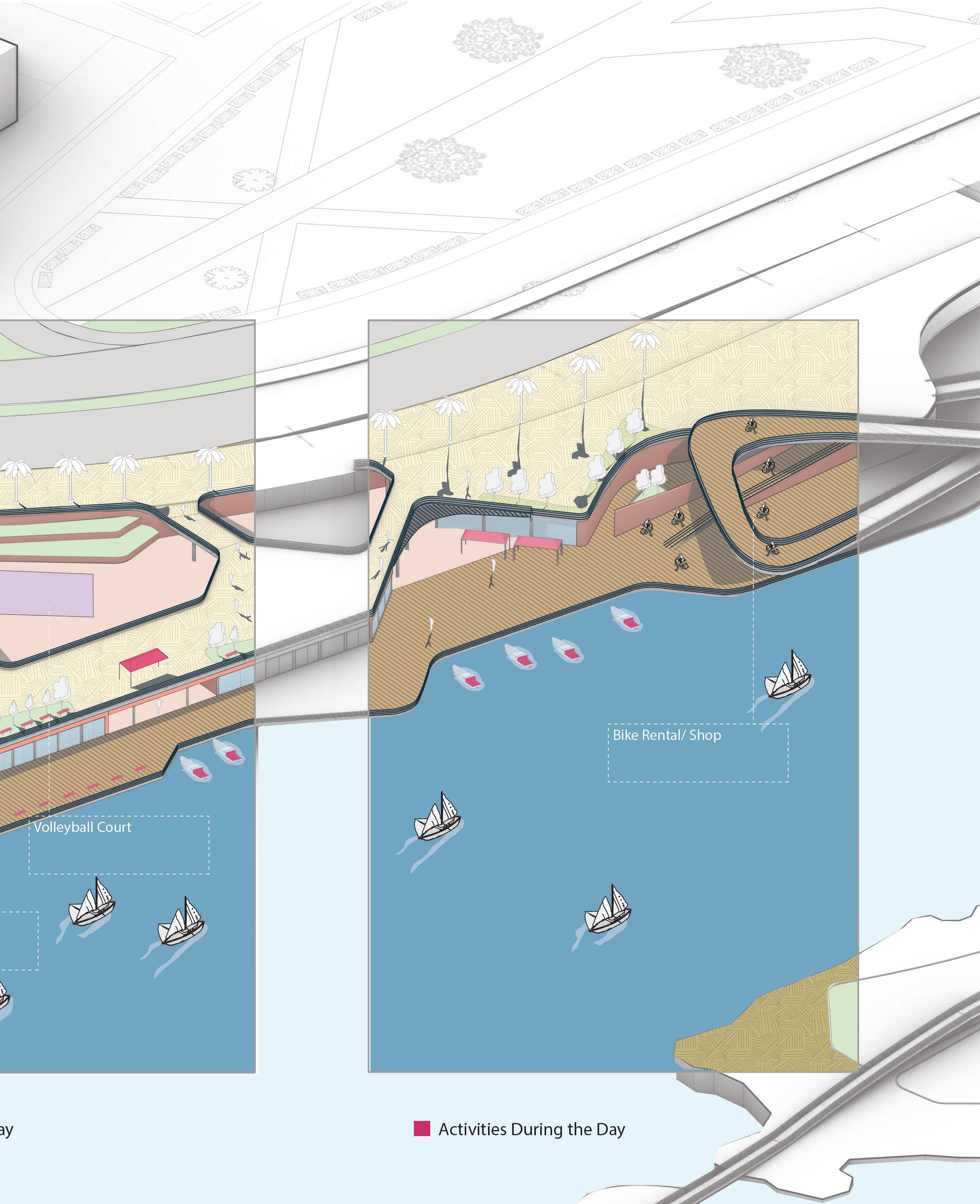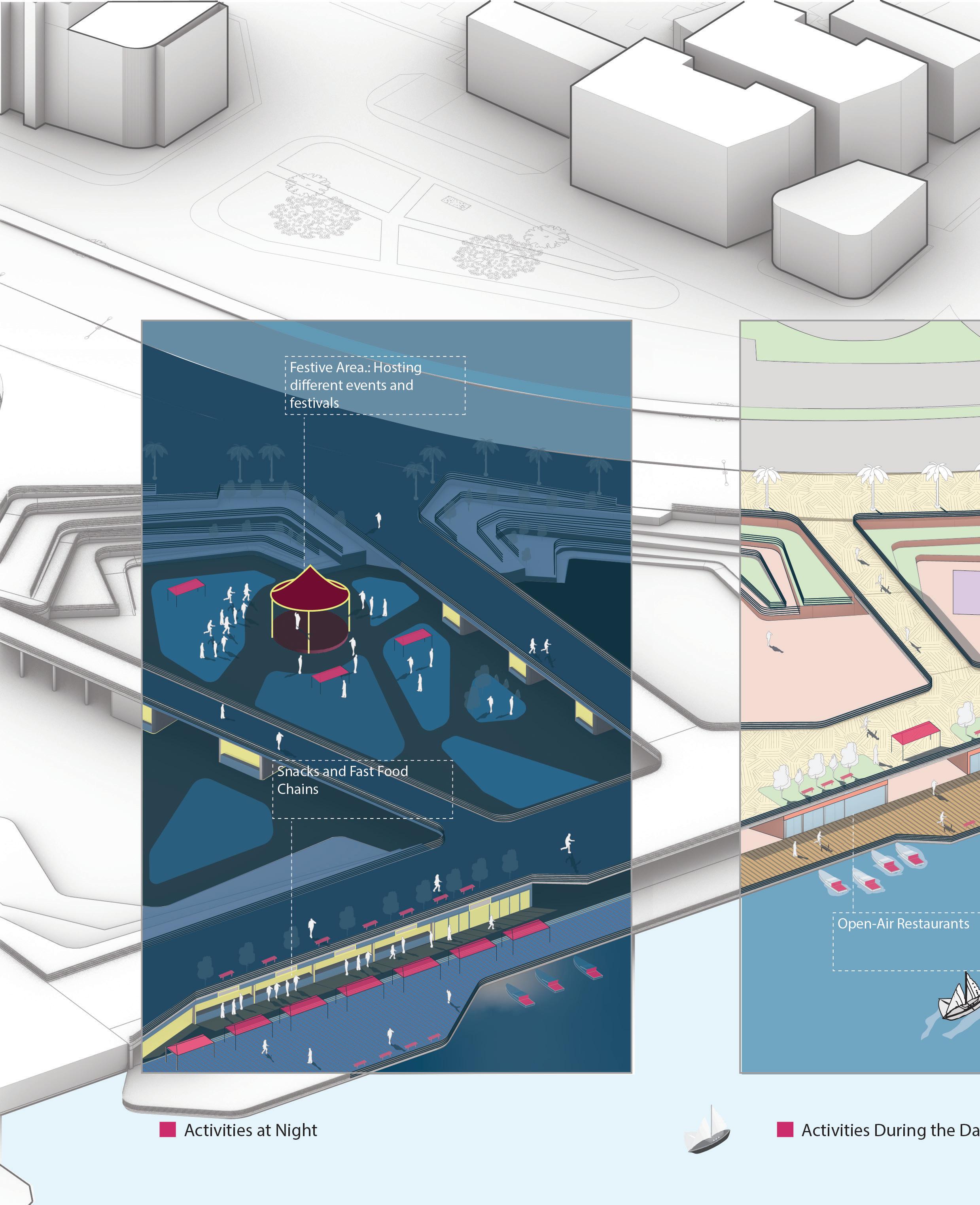 This project reimagines Tripoli’s Mina Corniche by extending its urban fabric seaward and reconnecting it to a nearby island. It follows a dual approach: a dynamic public waterfront that enhances the corniche with new amenities and an ecological preservation resort on the island. The waterfront transforms into an active social hub with layered public spaces, while the island remains largely untouched, hosting only a minimal conservation center.
