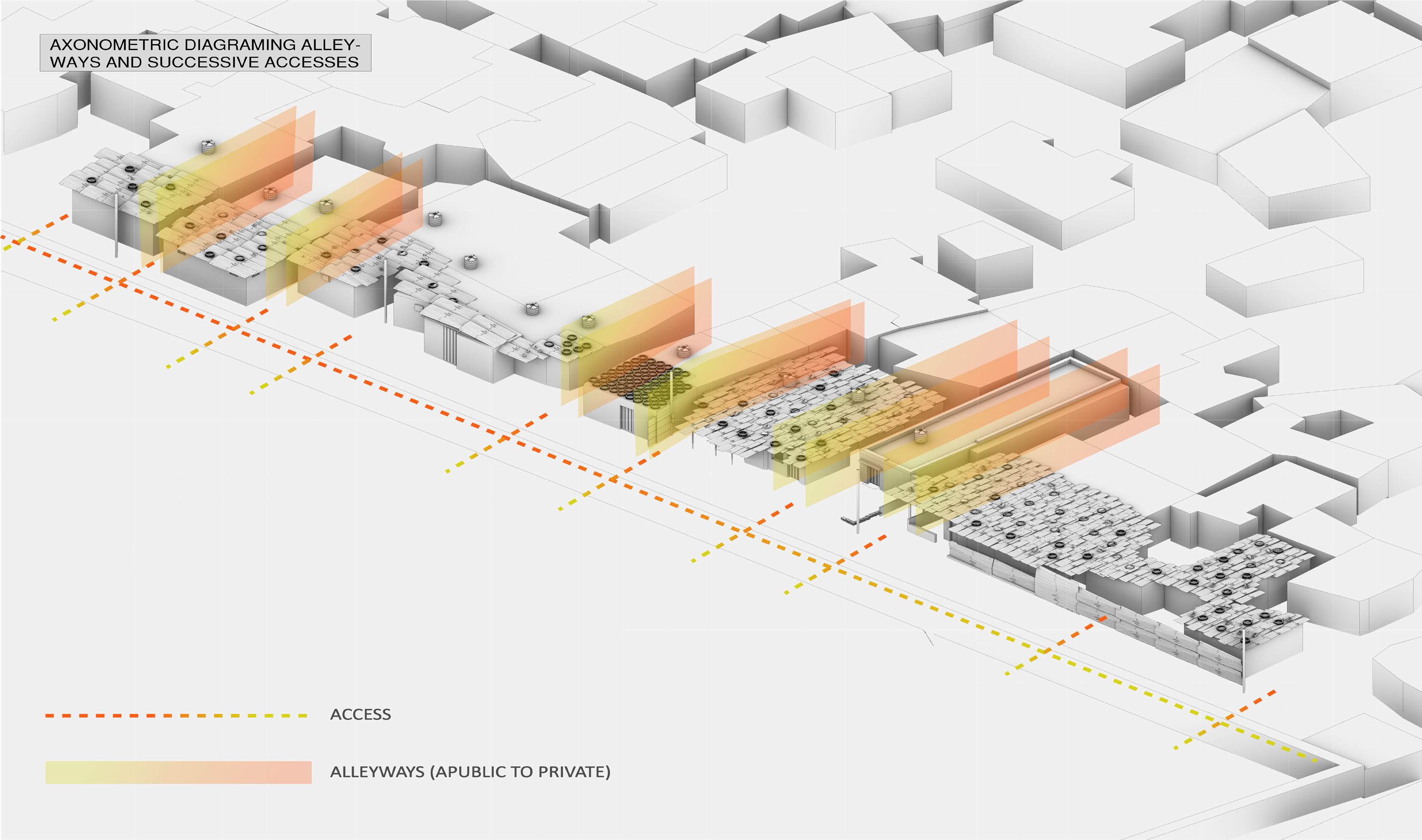 This strip from Hay Al Tanak resembles the main features of its fabric. The blurred realtionship between the narrow “private” alleyways and the public street was a form of adaptation to the living circumstances.