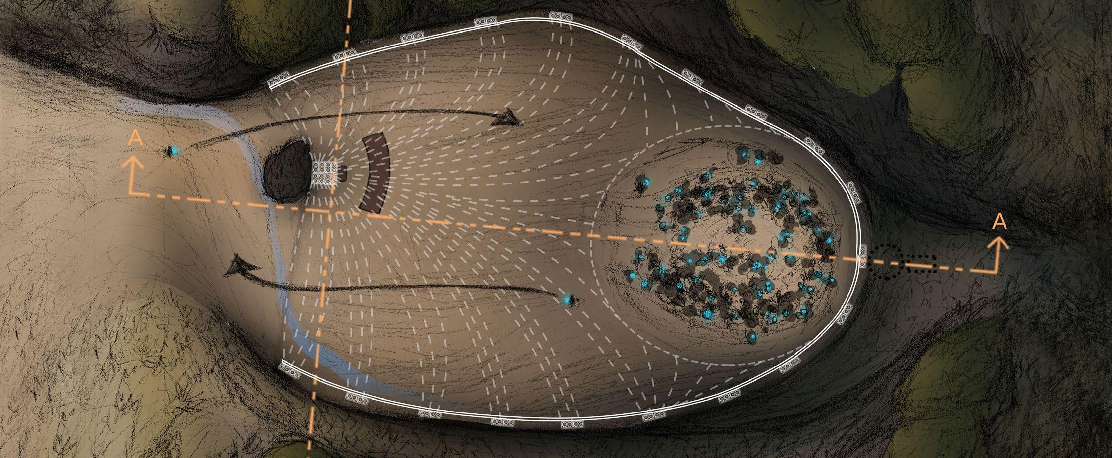 Located between Myers Park and the Theatre District of Auckland CBD, the upper intervention aims to intertwine public performance activities with quality outdoor nature spaces. This intervention is characterised as the âheadwatersâ; a place where the body of water is fed to form the beginnings of a stream. Since the location of the site is in the theatre district of the city, the activities carried out in this intervention are outdoor performance activities, such as outdoor movies and shows, small acoustic performances, and art and light installations.