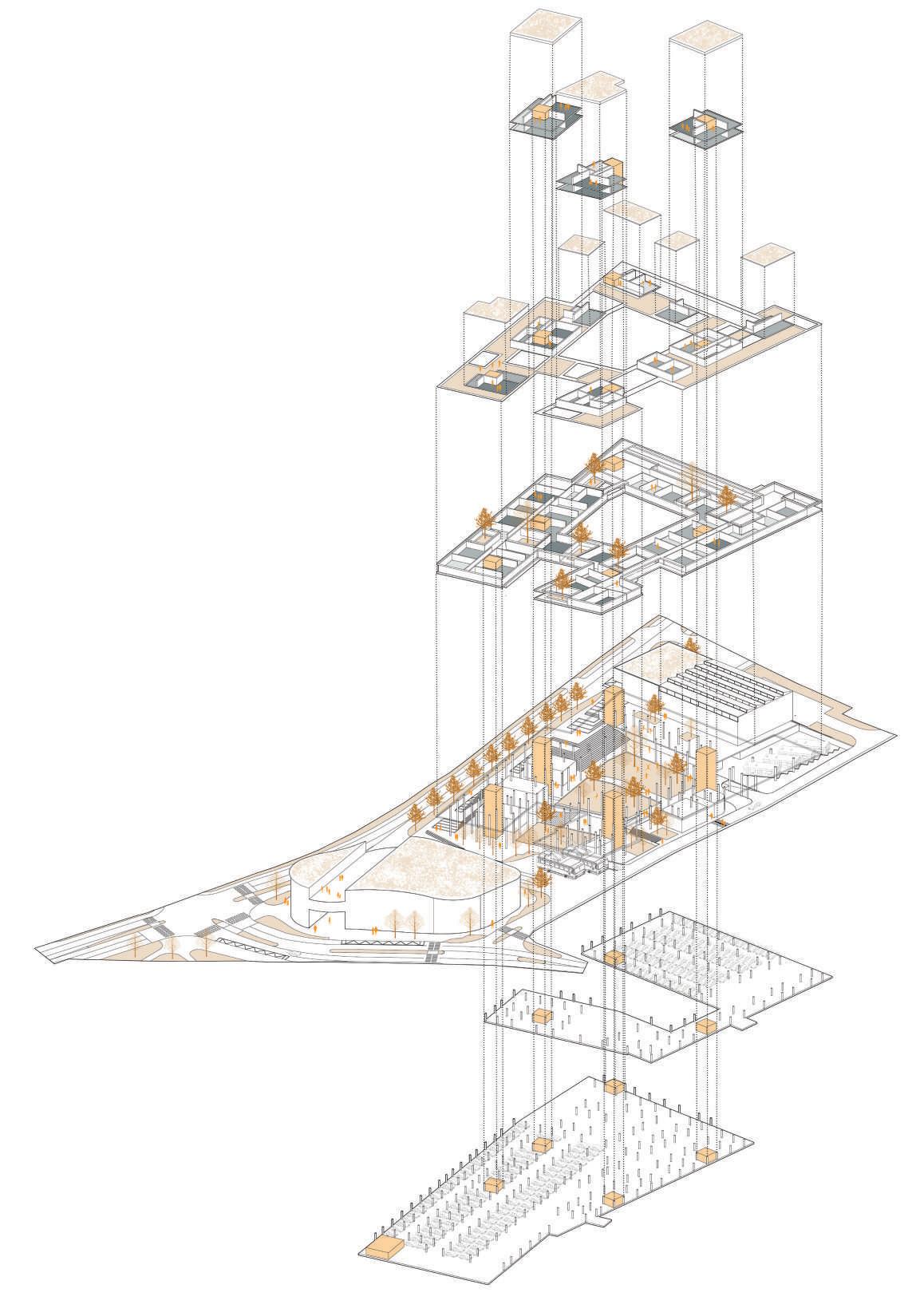This residental building is designed with the intenton of being a landmark for the city. It’s high of 141 dwellings and iconic fgure must be recognizable from anywhere in the city. The area where this parcel is located is now a poor developed area with no further infrastructure, this is the reason why within the program is included a supermarket, a food court and 3 foors of ofces for either residents or outsiders.