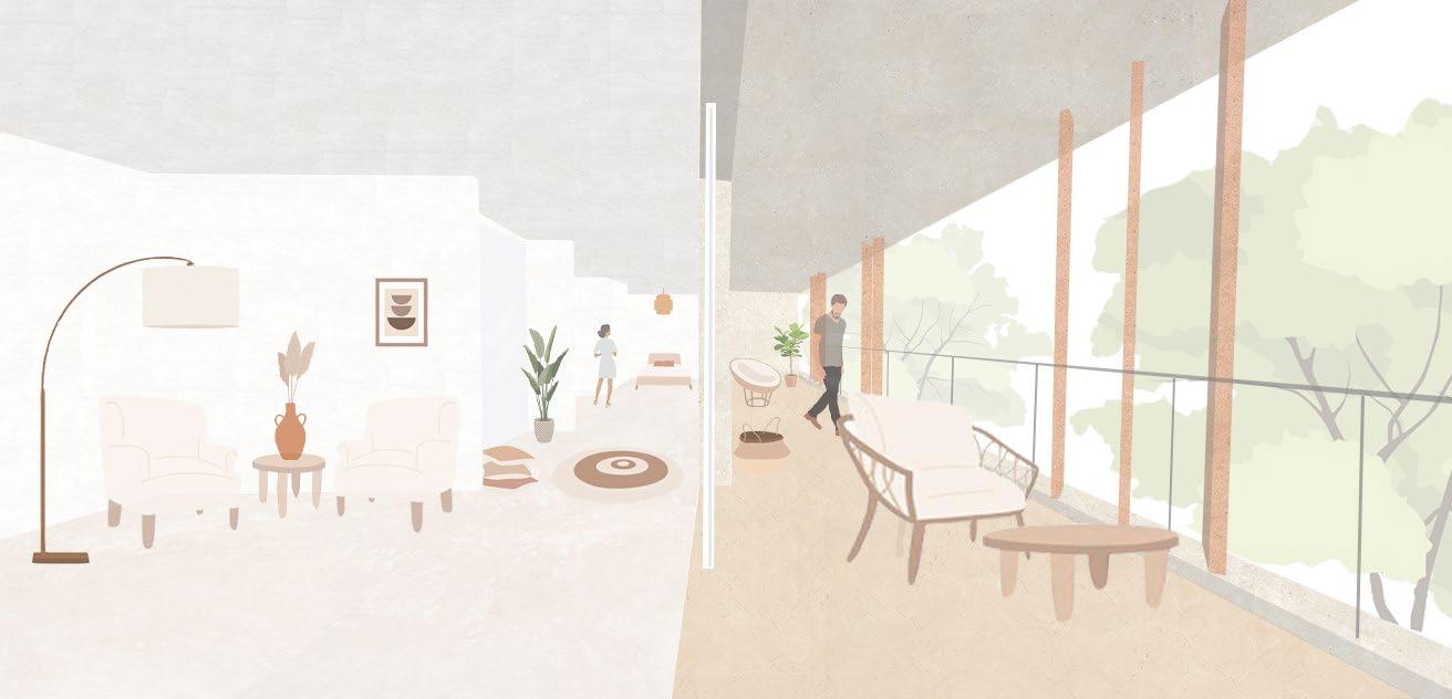 Au-delà est un projet réconciliant l’Homme et l’eau d’une utopie raisonnable qui s’inscrit dans un futur proche tout en anticipant une temporalité plus lointaine. Au delà est un engagement social qui vise à redonner l’accès à la mer pour tous en luttant contre la spéculation foncière. Le projet défend un nouveau système coopératif qui remet en question le mode de vie connu aujourd’hui dans ses dimensions sociale mais aussi économique, constructive et écologique. On choisit de proposer un logement saisonnier abordable, à moindre coût et impact sur le territoire. Au-delà du temps, au-delà du présent, au-delà de la peur, audelà d’un avenir incertain, au-delà d’un système capitaliste inégalitaire, au-delà de nos repères.