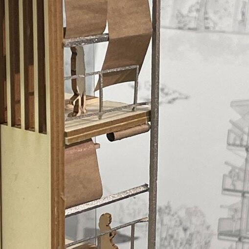 Un jeu de plein et de vide, se traduisant par les modules coulissant horizontalement, laisse place à la révélation d’une multitude de vues en fonction de leur configuration sur les niveaux. Le vide est ici mis en valeur car c’est dans l’absence que se révèle le paysage. La cabane se réinvente et devient support d’expression et de réinterprétation in situ de l’oeuvre qui se construit par le public, c’est par ce dernier qu’elle existe et qu’elle se définit.