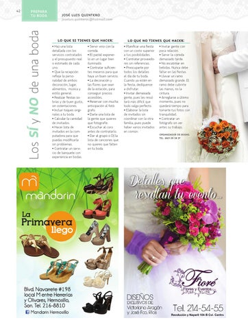 • Invitar gente con poca relación. • Servir la comida demasiado tarde. • No escatimar en bebidas. Nunca debe faltar en las fiestas. • Llevar un ramo demasiado grande. El ramo debe cubrirte las manos, no la cintura. • Arreglarse a último momento, pues no quedará tiempo para tomarte tus fotos con tranquilidad. • Contratar un fotógrafo sin ver antes su trabajo. Organizador de Bodas. tel. 6621 20 28 37