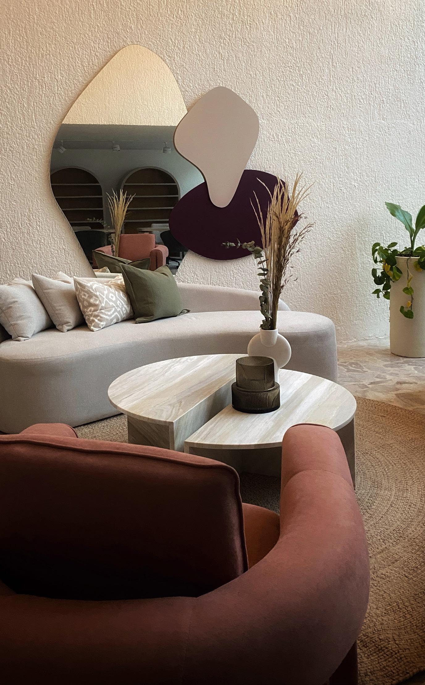 Para el diseño interior se seleccionaron maderas y textiles representantes de Sonora, como los son la madera de Palo Fierro y la tecnica de bordado Haat. Además se siguio el motivo del numero 4 en celosias, barandales y objetos decorativos.