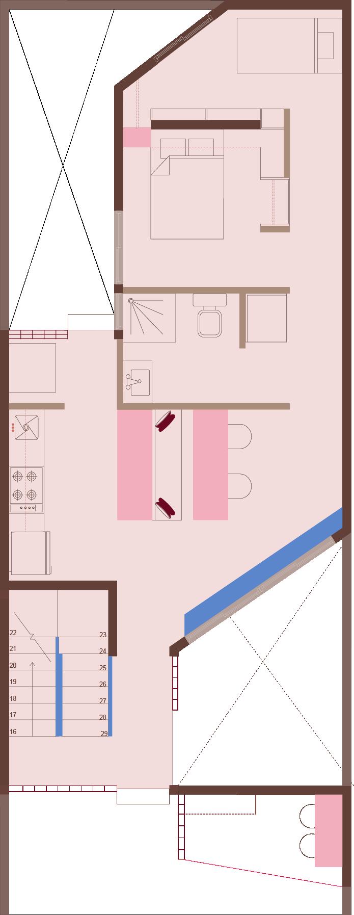 La organización del departamento se estructura a partir de una clara separación entre las áreas pública y privada, articuladas por el núcleo de baño ubicado al centro de la planta, permitiendo un acceso equitativo desde ambas zonas. El área social integra sala y comedor en un mismo sistema de mobiliario, lo que optimiza el uso del espacio y permite incorporar mayor capacidad de almacenamiento.